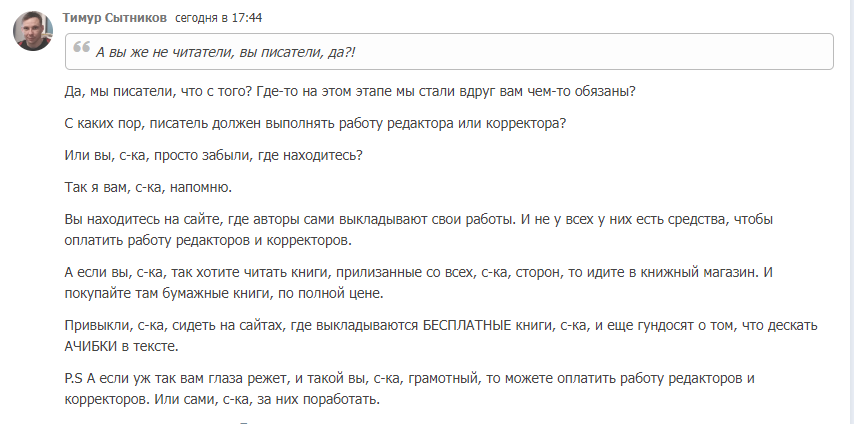 Но нет, адекватного ответа я не получил. Впрочем, его и не следовало ожидать от человека, который совсем не понимает, где он находится. А потому, я еще раз хочу напомнить, что находимся на АТ. На литературной площадке, в интернете. И авторы тут выкладывают свои книги сами, без поддержки издательств. И не у всех есть возможности нанимать редакторов и корректоров.