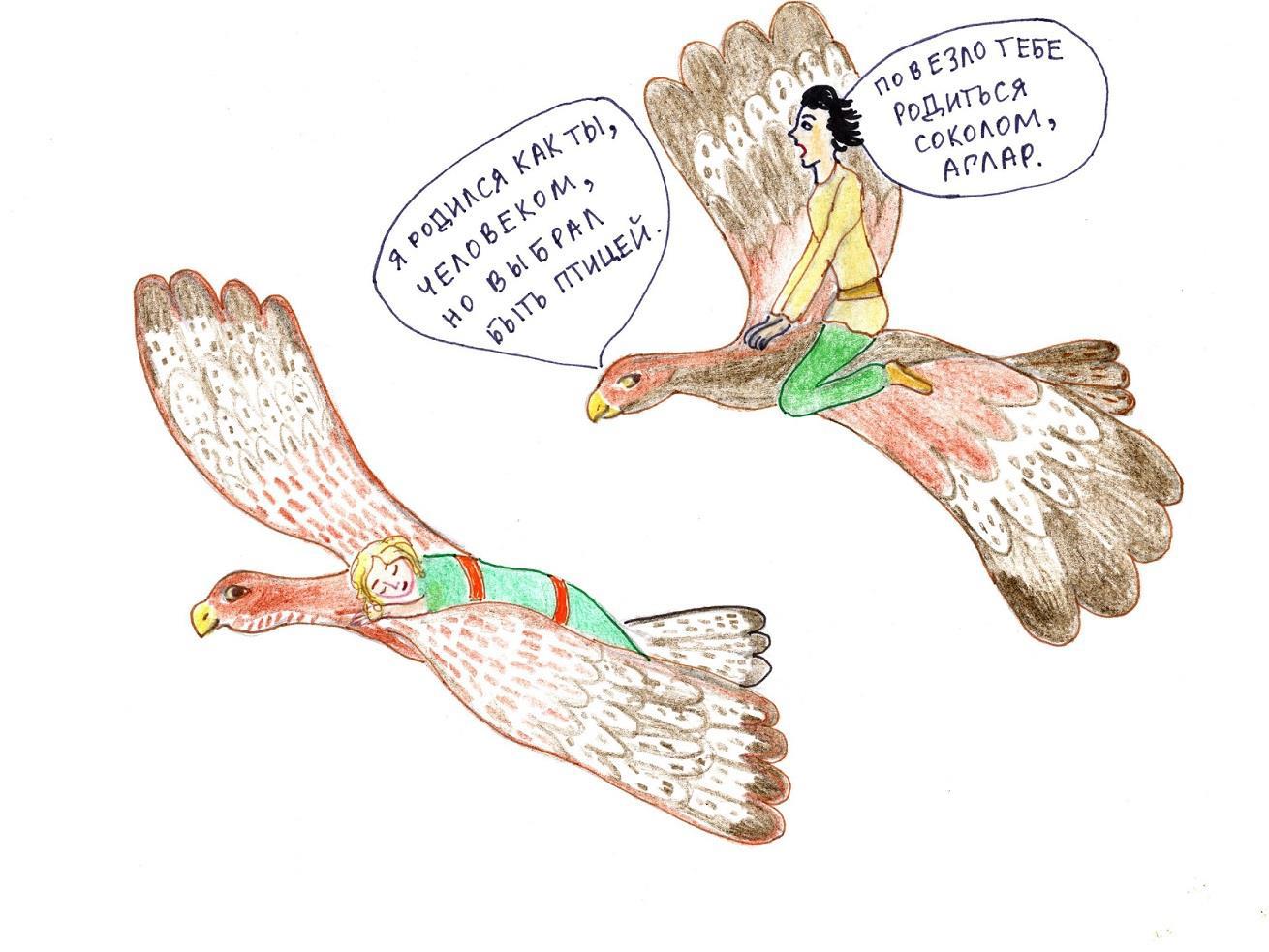 Конечно, Юниэр не смог бы дойти до Ориены пешком. Ему помогают могучие соколы, братья Аглар и Султар.