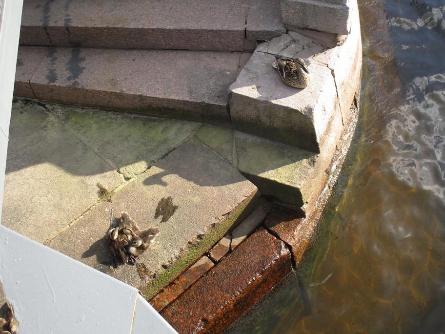 А это уже на Сенатской пристани. Под мостками, сбившись в кучку, спали утята, а утка-мать сидела чуть выше, совершенно неподвижно, как постовой. Надеюсь, утят просто разморило и у них была сиеста, они все тоже не двигались.
