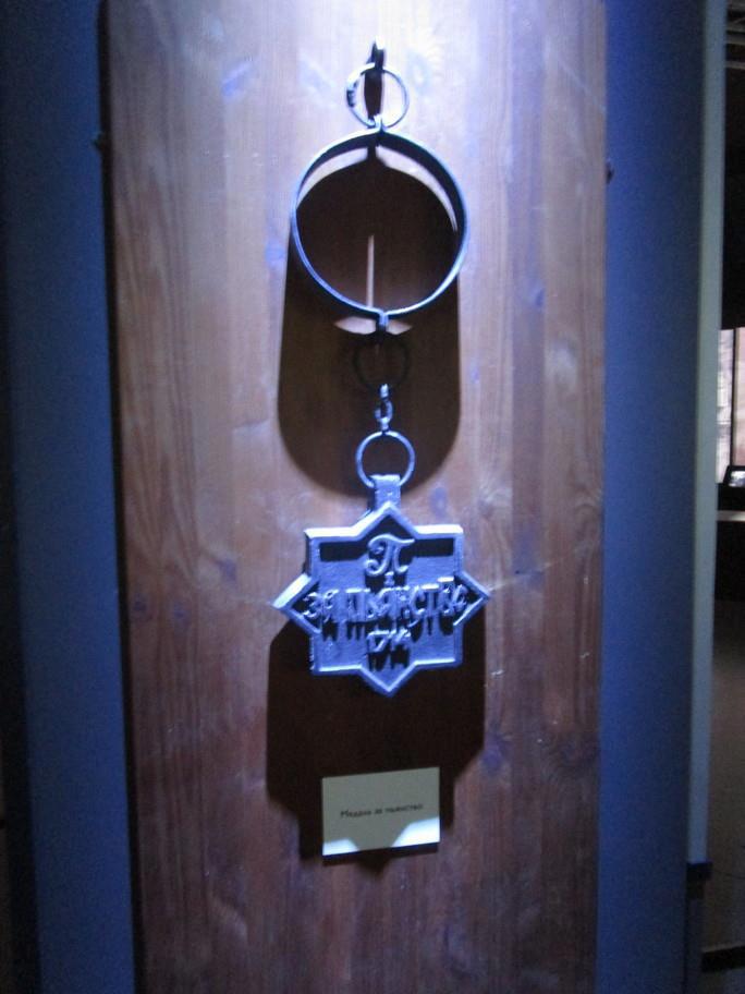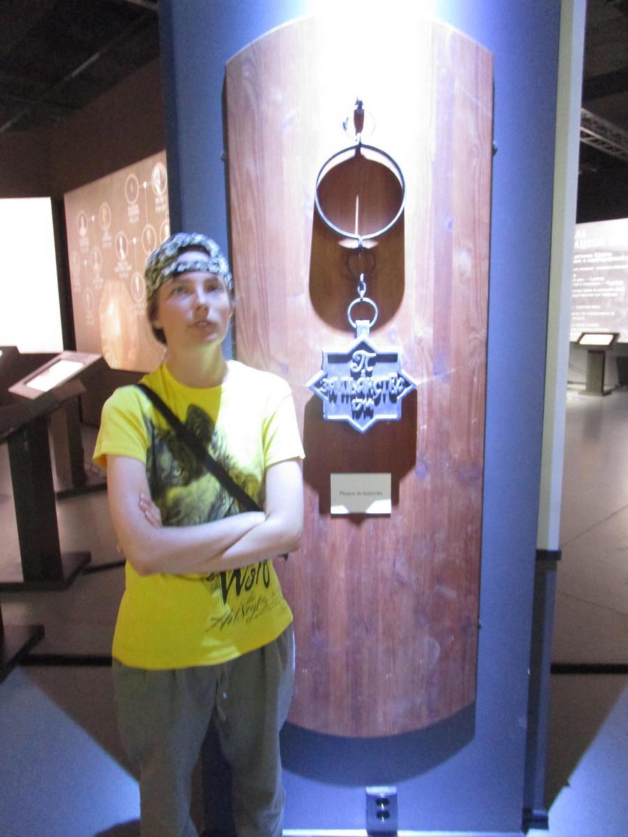 Медаль за пьянство. Эту тяжелую железную штуку, привешенную к железному ошейнику, насколько я понимаю, вешали на шею пьяницам в наказание. Попросила подругу встать рядом, для масштаба, чтобы были видны размеры этой штуки: