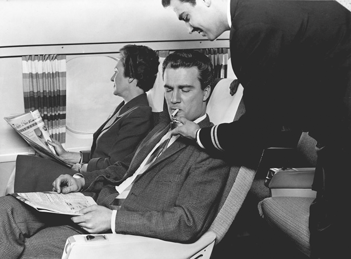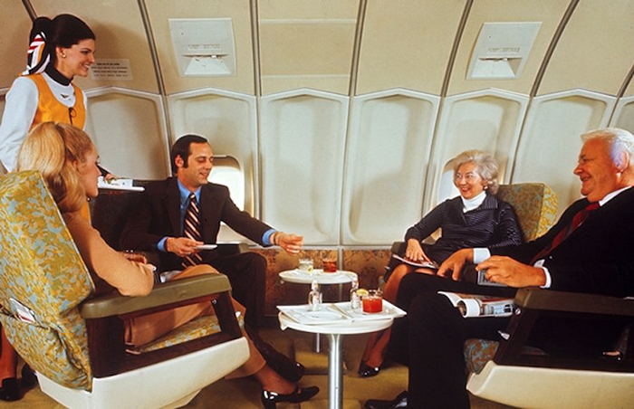 Позволить себе подняться в небо "свингующих шестидесятых", эпоху рок-н-ролла, мини-юбок, ЛСД и войны во Вьетнаме мог далеко не каждый – и конечно же, своими клиентами авиакомпании очень дорожили. Уровень комфорта пассажирских самолетов крупных компаний был сравним с нынешними бизнес-джетами. Просторные салоны, удобные кресла, перемены блюд, любой алкоголь, курение без ограничений, вышколенные красавицы-стюардессы. При желании, на борту мог найтись даже рояль. Заманить пассажиров старались всеми возможными способами – к примеру, Western Airlines предлагали шампанское бесплатно каждому пассажиру старше 21 года, став любимой авиакомпанией голливудских звезд.