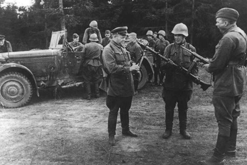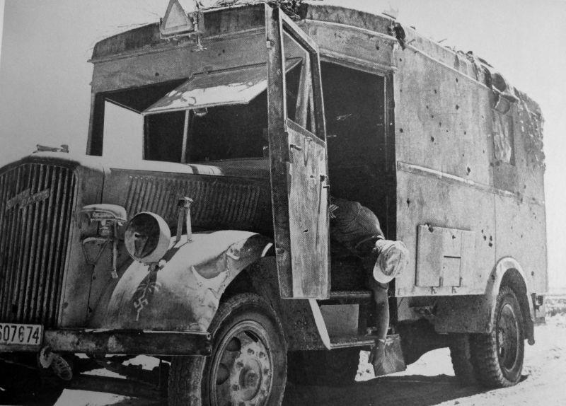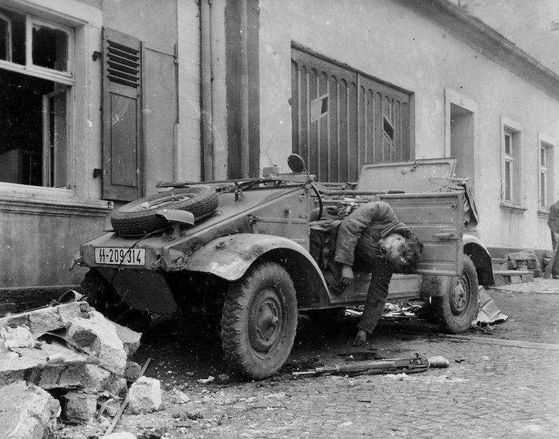 Убитый водитель свесился из кюбельвагена. Характерная поза для убитого.
