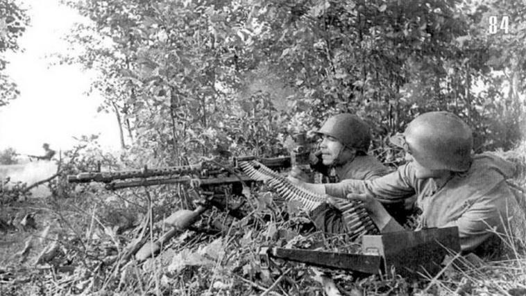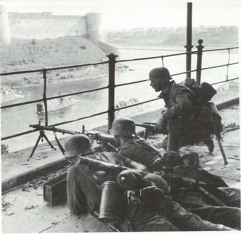 Пулеметный расчет (Стреляют из Нарвы в сторону Ивангорода). Командир отделения смотрит, чтоб стреляли куда надо. Второй номер - с футляром запасного ствола на спине.