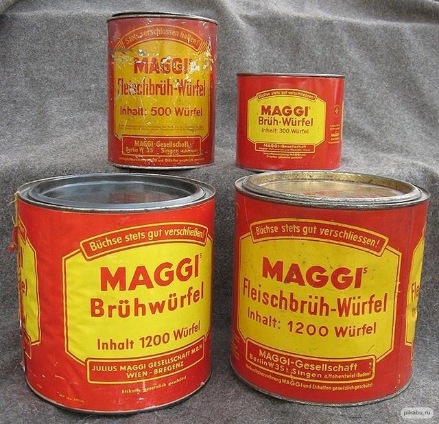 Кубики Магги. В большой банке - 1200 бульонных кубиков. Удивляет то, что на правой написано, что мясной бульон, а на левой - просто бульон. При этом бульон из костей и жил - все равно назывался мясным. Овощной что ли?