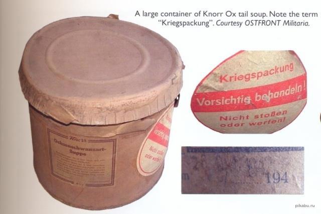 Большая армейская упаковка супов "Кнорр". "Криегспакунг! Обращаться с осторожностью! Не бросать!" Суп из бычьих хвостов - "Ochsenschwanzartsuppe".