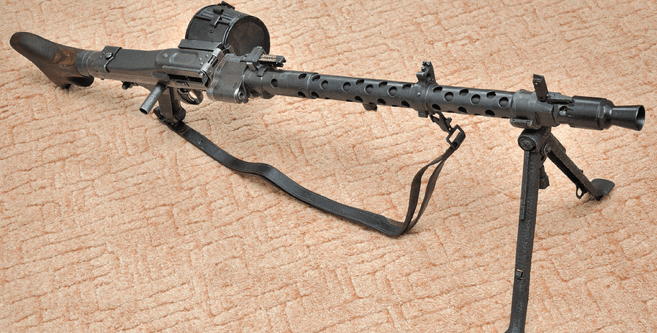 Ручной немецкий пулемет МГ-34 с магазином-"кексом" на ленту в 50 патронов. На этом фото странное размещение сошек.