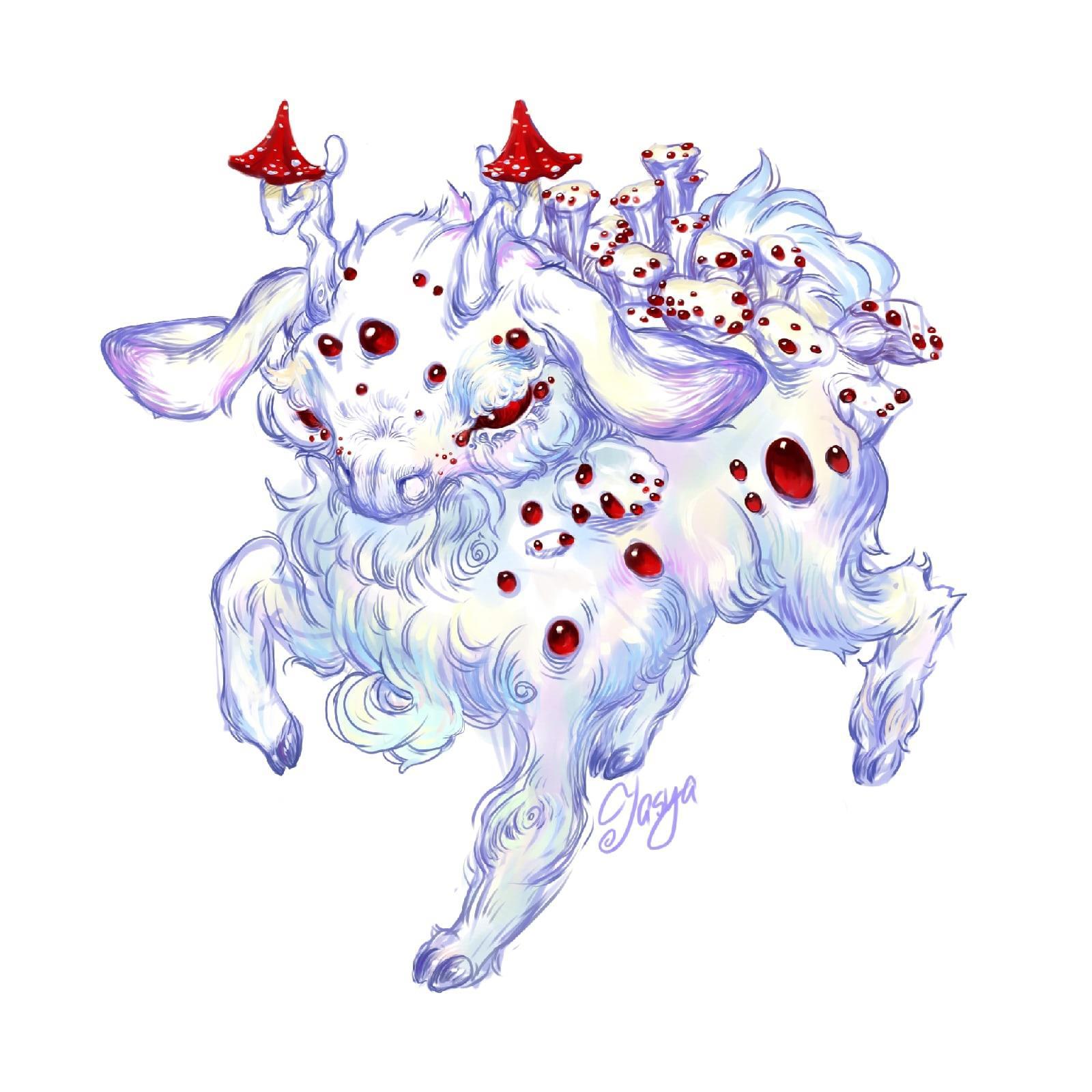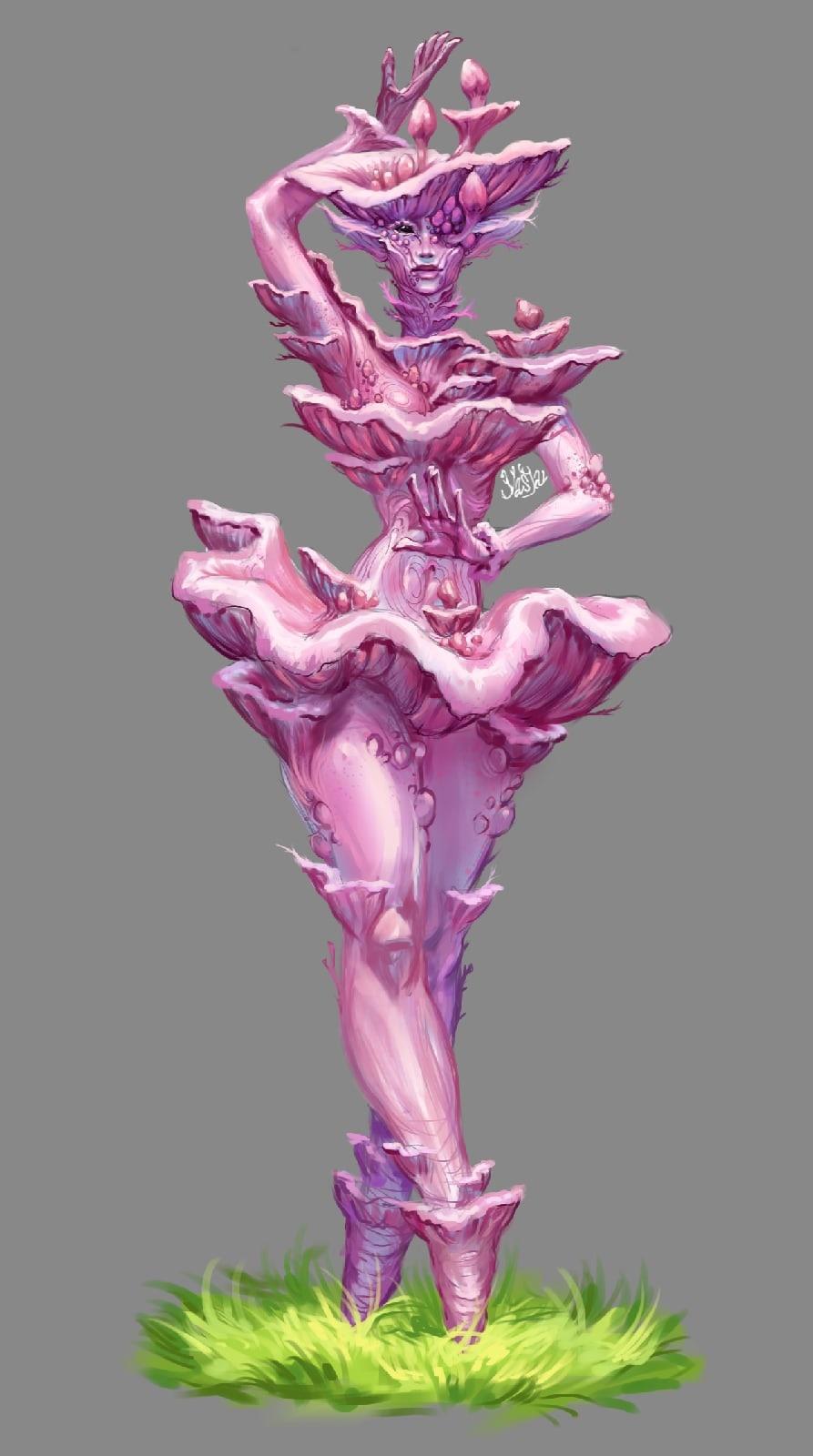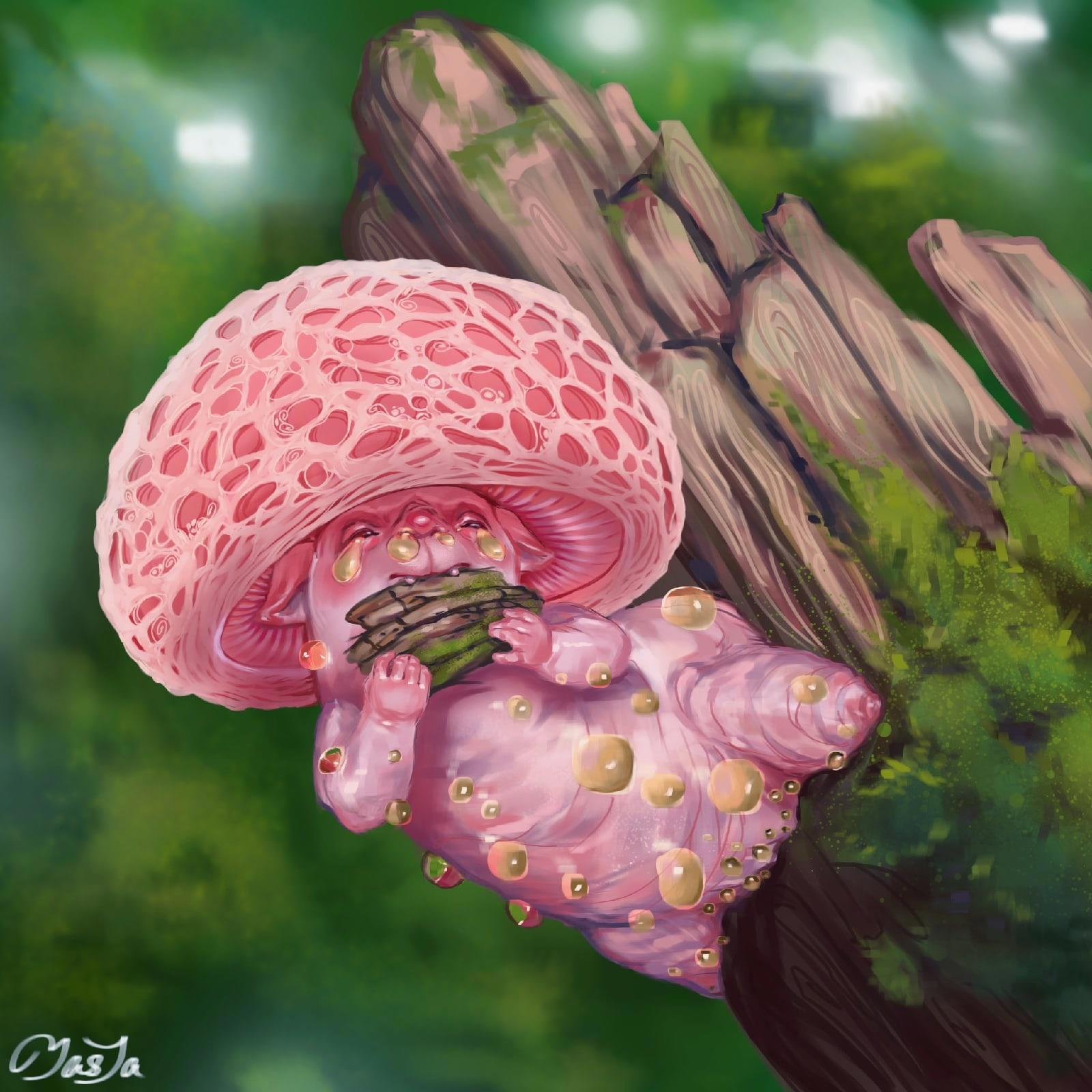 По поводу этого арта у меня смешенные чувства, сначала арт мне нравился, сейчас - не знаю. Что-то в нём есть неудачное и нелепое, однако одновременно и что-то интересное, необычное и может местами загадочное. Ещё в википедии мало чего написано про этот гриб, а я лично, особенно на такие тематики, вдохновляюсь через усвоение новой информации или как минимум знания на тот объект, что ты пытаешься создать, дают тебе ряд свойств, благодаря которым, твой герой становится уникальным. Но как же я не люблю розовые оттенки, местами терпеть не могу, по окончании этого арта я была очень рада, что мучительные для меня розовые грибы закончились, хахыв