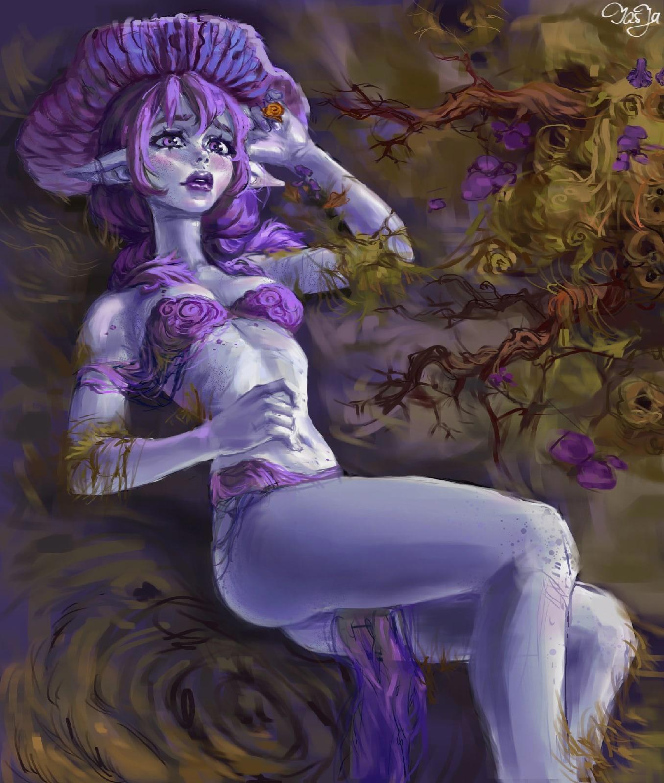 Гриб этот называется лаковица аметистовая, тоже не менее волшебный гриб. На этом арте мне очень нравится какм вышёл фон, я его рисовала по собственным ощущениям из детских снов, которые оказали на меня большое впечатление в своё время. Как-то так