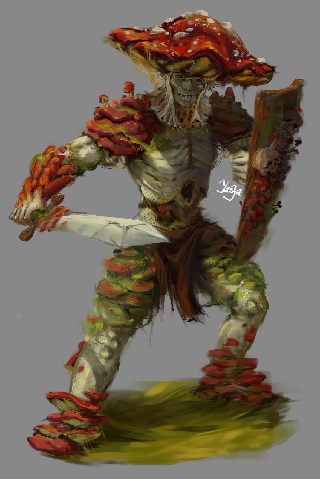 Да это, возможно, с ума сойти как тривиально нарисовать аманиту рыцарем, но сроки были сжатые, так что времени для оригинальной и неповторимой идеи, особенно для такого избитого в образах гриба, у меня не было. Я очень сильно вдохновлялась Верёхином, мне кажется это заметно, когда рисовала этот концепт