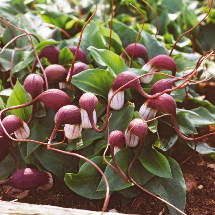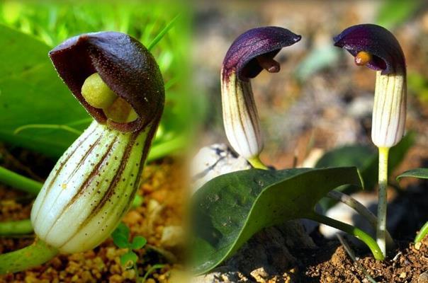 В отличие от знакомых калл и антуриумов у аризарума покрывало – вот такой забавный бокальчик с мышиным хвостом.