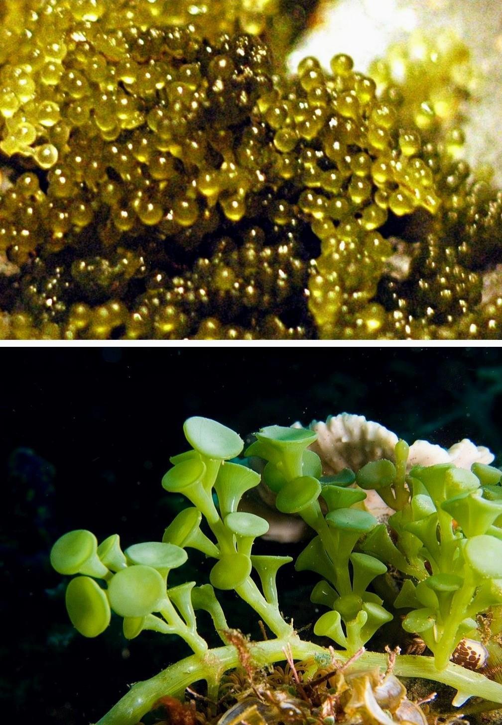 На фотографиях виды Caulerpa lentillifera и Caulerpa racemosa.