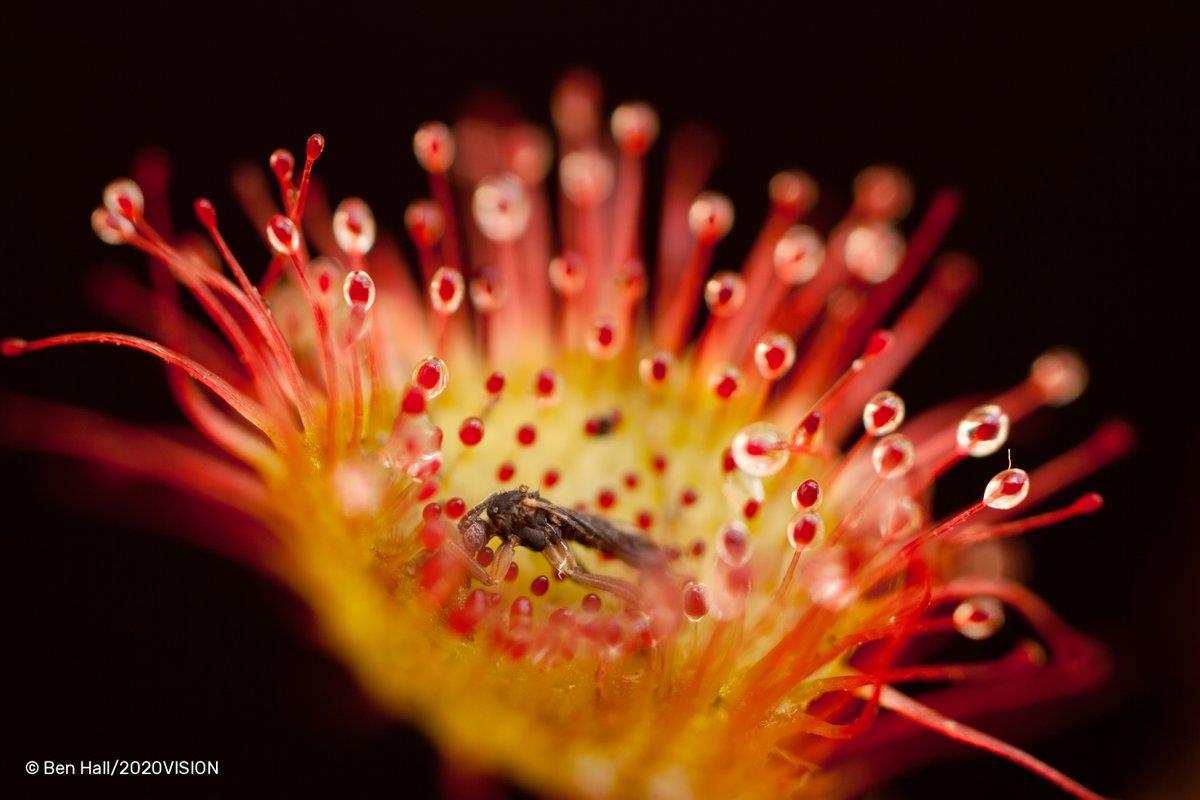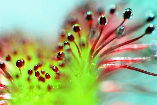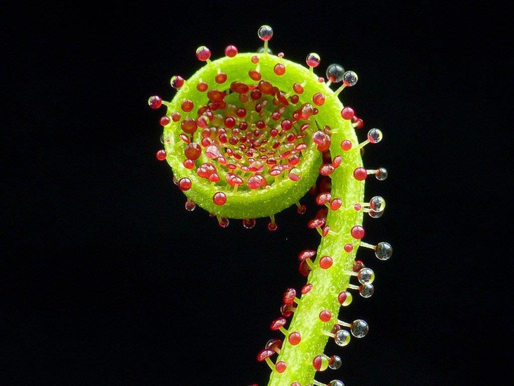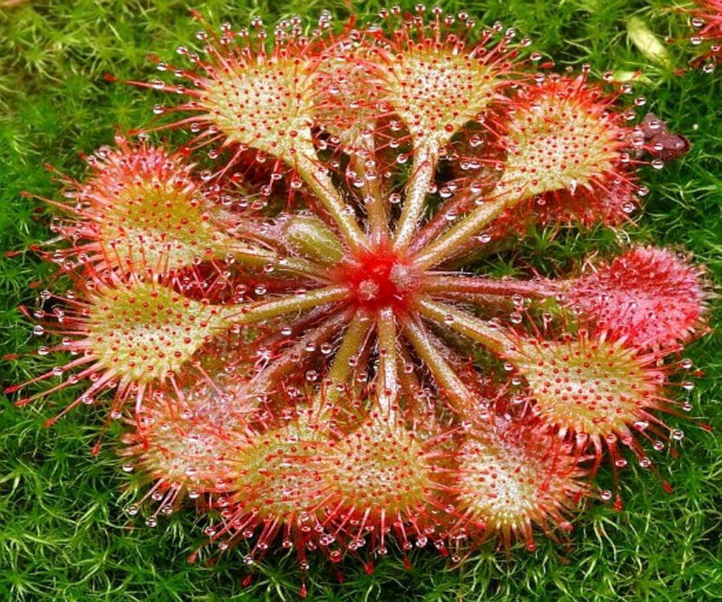 Ловчие листья этого хищного растения покрыты многочисленными волосками, на кончиках которых блестят капельки клейкой жидкости, привлекая внимание насекомых. Манящие капли в реальности оказываются смертельной ловушкой для потенциальных жертв.