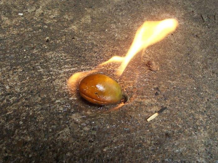 но это не елинственное растение с таким названием...их ажно два - парментиера съедобная, и тунг молуккский ...последний -набольшие орешки ,около 5 см,оч богатые маслом- отменно горят без копоти...они ,кажется из семейства молочаев...не помню...но или совсем ядовиты,или могут быть ядовиты...а может и что-то в них ядовито..."