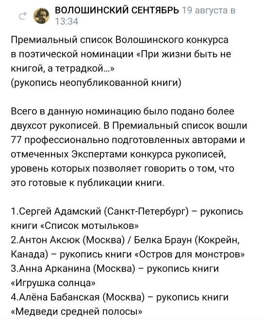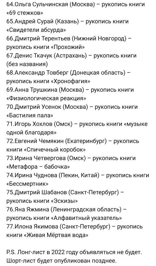 Список, конечно, получился очень обширен, но все-таки честное семьдесят седьмое место. Как почетный попаданец в лонг-листы, поздравляю также Евгения Коновалова, Дмитрия Мурзина и Веронику Батхен. С ними и постоять рядом приятно.