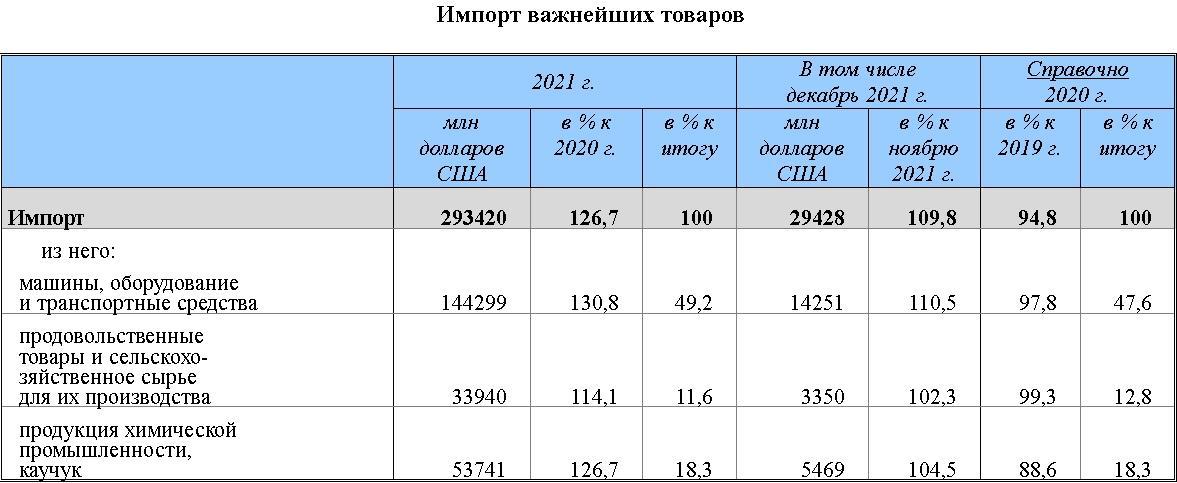 В товарной структуре импорта наибольший удельный вес приходился на машины и оборудование – 49,2% (в 2020 году – 47,6%). В товарной структуре импорта из стран дальнего зарубежья доля этих товаров составила 52,6% (в 2020 году – 50,8%), из стран СНГ – 20,7% (21,2%).