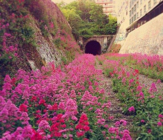 *Железная дорога Petite Ceinture. Франция. Вторая фотография уже не выглядит такой мрачной и депрессивной. Все-таки цветы - это хорошо :)