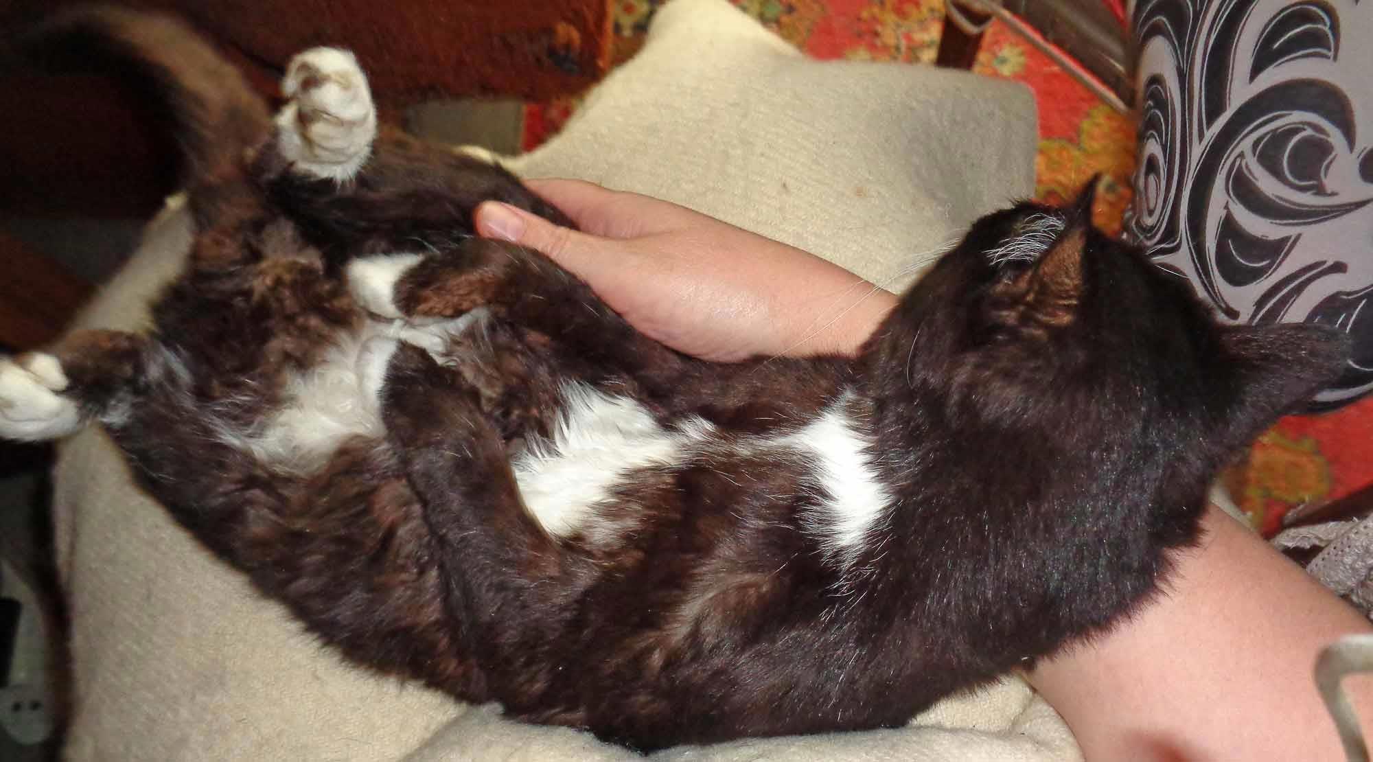 Единственное, что он сейчас соглашается съесть самостоятельно - это небольшое количество сырой печёнки (перемороженной перед употреблением, как положено). А после приёма пищи "с рук", Кот на этих же руках предпочитает расслабиться и поспать.