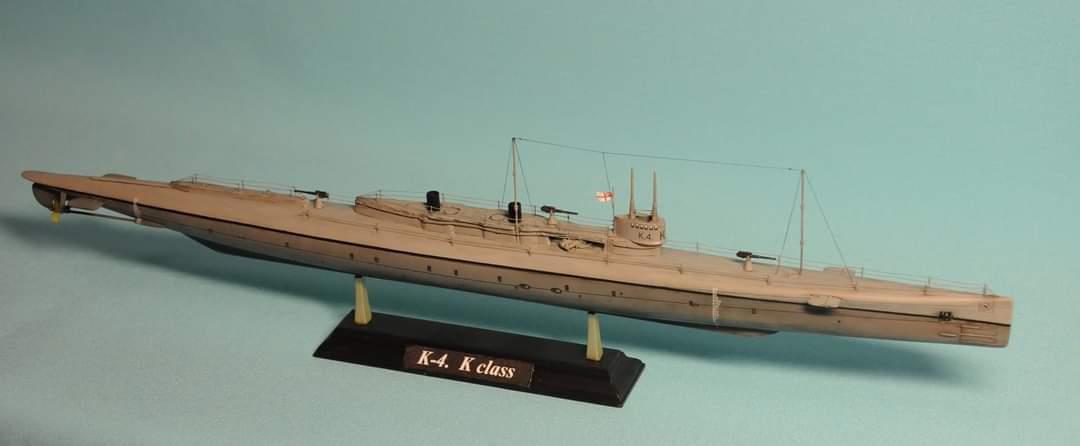 (Подводная лодка "K-4" была заложена на верфи Vickers 28 июня 1915, спущена на воду 15 июля 1916, вошла в строй 1 января 1917. Лодка прослужила чуть больше года и погибла 31 января 1918 в «битве у острова Мэй», столкнувшись с другой лодкой K6, её экипаж трагически погиб.)