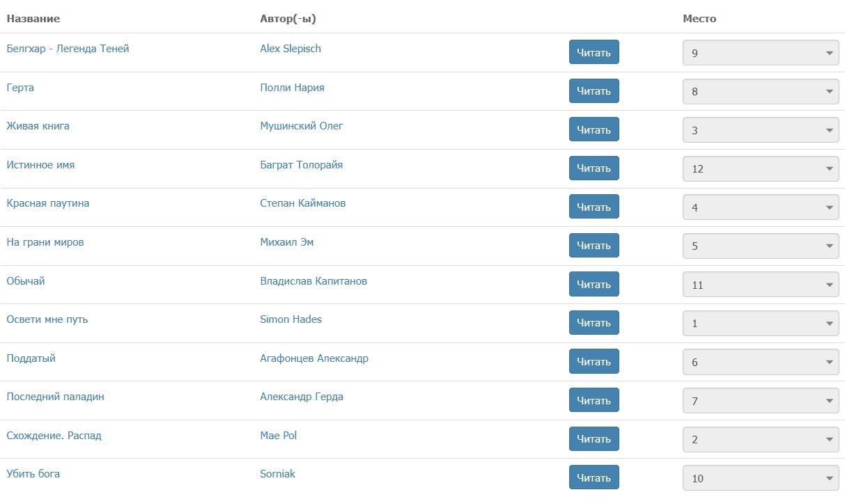 Вот такая таблица у меня вышла. Еще раз извините, кого расстроила, но увы, на самосуде все равно кто-то да окажется в хвосте (((