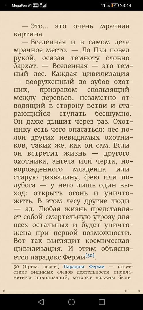 Прочитав (перечитав) первые две книги в осмысленном возрасте, я теперь даже готов поспорить с теорией Тёмного Леса, высказанной китайским фантастом Лю Цысинем. Если вы помните, я давал здесь подробные обзоры на его книги, и пускай теория Тёмного Леса отлично объясняет Парадокс Ферми, но... но на мой скромный взгляд высказанные Орсоном Кардом мысли логически противоречат Тёмному Лесу. Сильно вкратце о теории Тёмного Леса Лю Цысиня вы можете прочитать на скрине. Только осторожно, это СПОЙЛЕР! (Если собираетесь читать "Тёмный Лес").