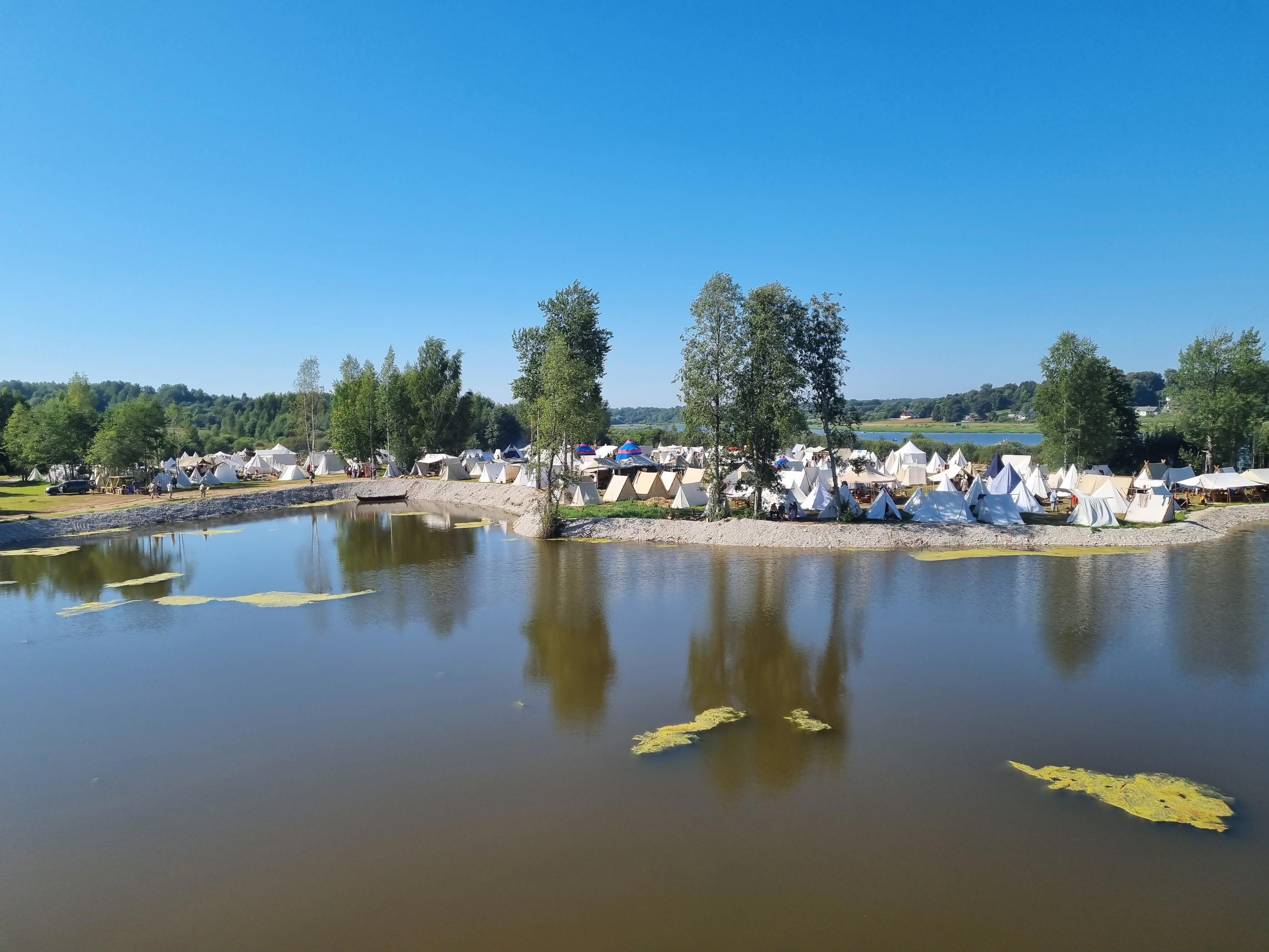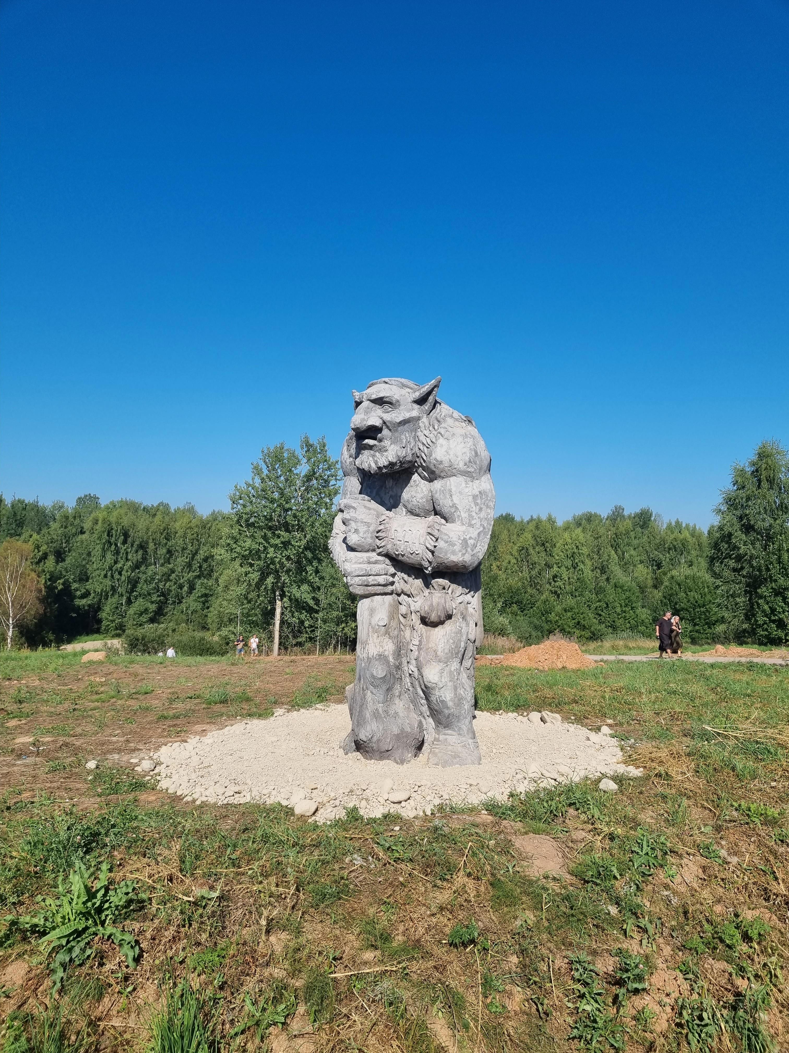 Две драконьи головы образуя портал обрамляли выход с парковки на территорию фестиваля, пришлось немного пройтись по живописному склону мимо шатра ресторана (далековато от основного места действия) и кэмпинга, о существовании которого я не знал (может и не пришлось бы так судорожно искать свободные номера в Новгороде). На пути стояли милые каменные изваяния мифических существ - тролли и гоблины. Полноразмерные ладьи привлекали детей возможностью налечь на вёсла, а первые палатки манили шипением кранов с напитками. С холма открылся роскошный вид на саму крепость, за стенами которой виднелись белые шапки палаточного лагеря, расположившегося у самой реки Волхов.