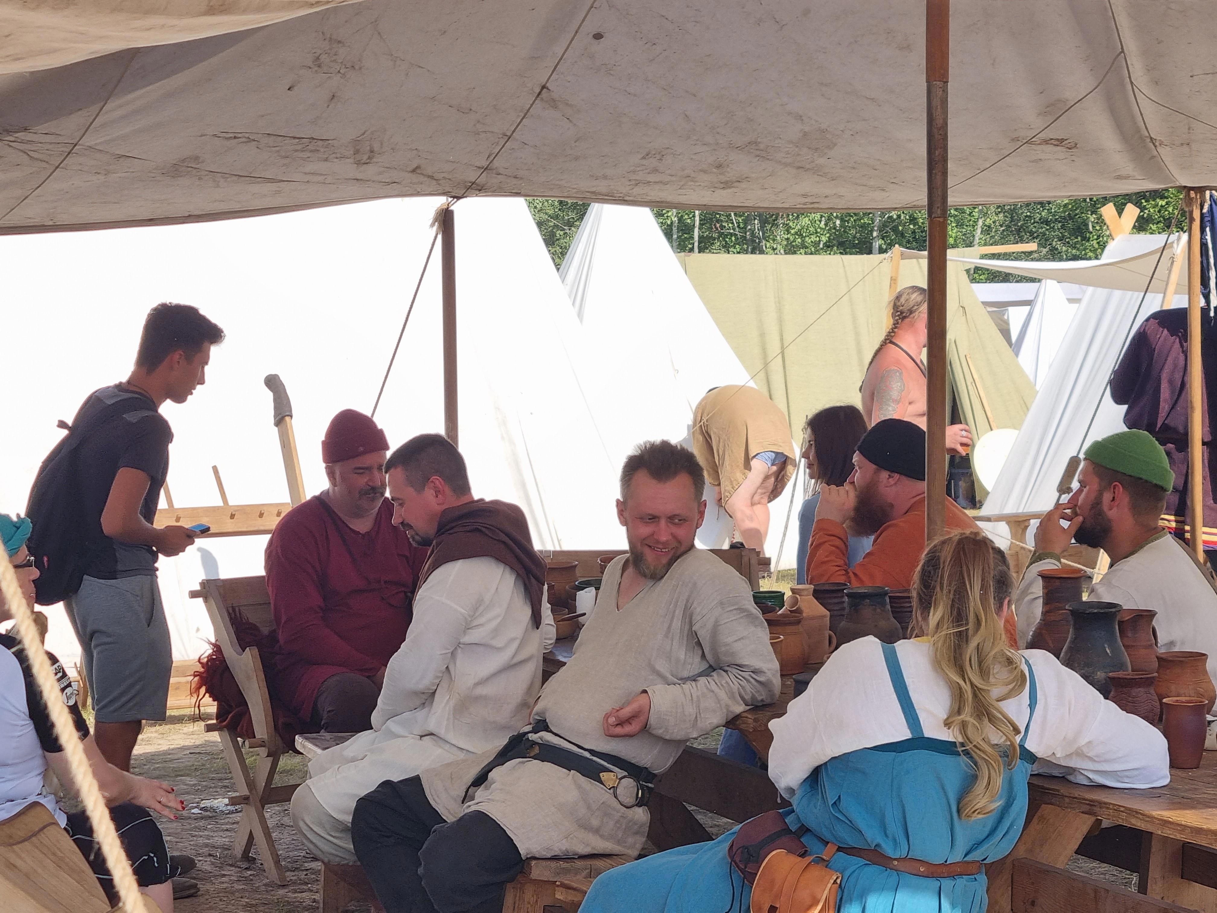 Через какое-то время стало понятно, что дуэли скорее представляют интерес для увлечённых специалистов, а обыватель вместо яростной битвы видит лишь осторожные выпады, где касание любой части тела означает завершение поединка. Раз стало скучно - значит пора на поиски приключений! Лагеря и мастерклассы ждут - дети попытали себя в стрельбе из лука под руководством специалистов и теперь могут самостоятельно практиковаться на даче, уже зная - как правильно это делать. Попытка поесть и попить рядом с тиром не увенчалась успехом - потратив около часа (!!!) времени удалось лишь выпить облепихового морса, да зажевать вяленым мясом. Квас кончился, а за настоящей едой очередь была ещё больше. Но позитивный настрой преобладал в окружении, поэтому время пролетело за интересной беседой с товарищами по очереди. Обсудили сложности с жильём в Новгороде, Питер, погоду, дорогу и всякое другое.