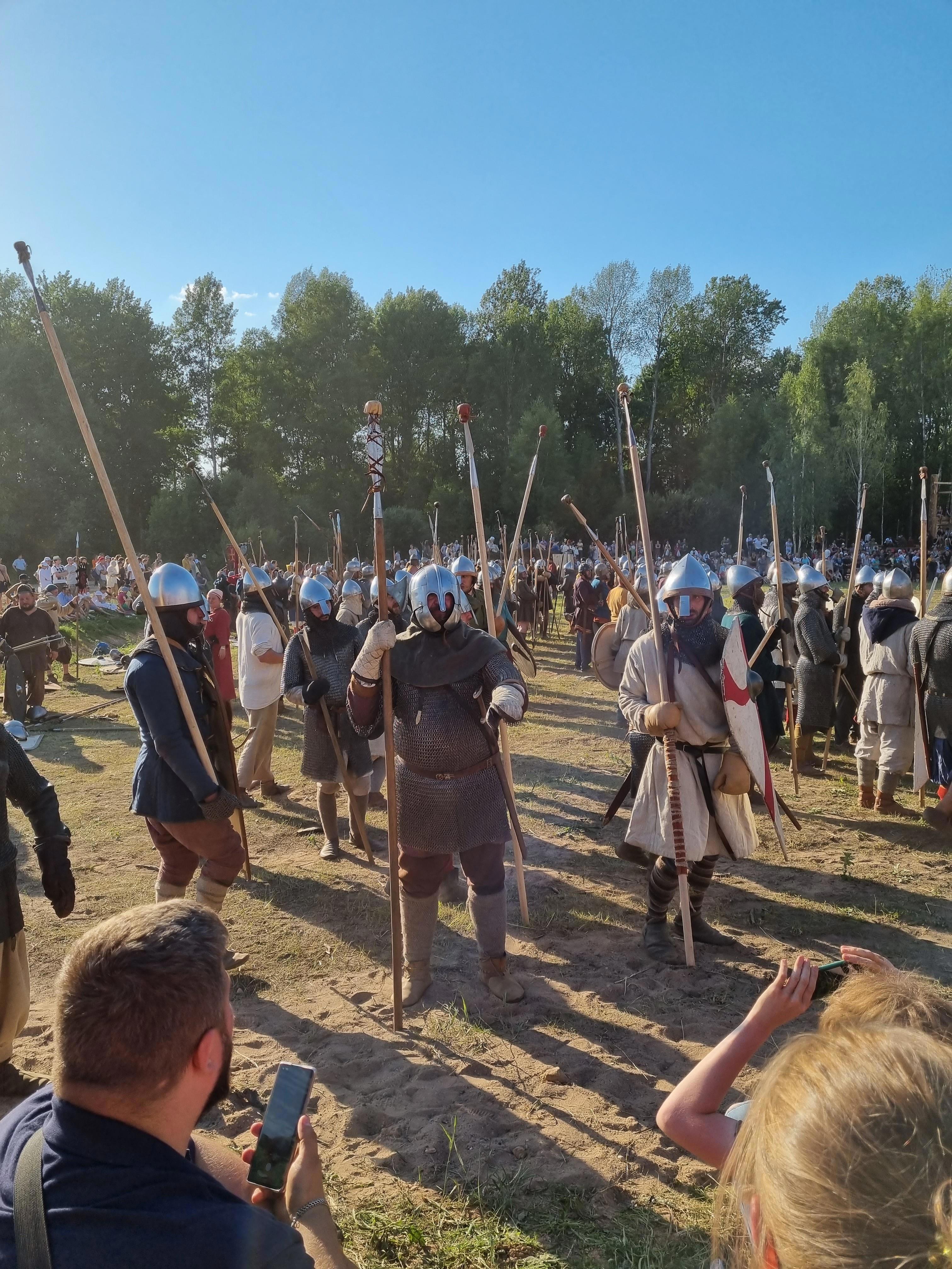 Начался сбор дружин - вот это было эффектно, надо признать. С музыкой, знамёнами, строем - сотни воинов выходили на поле боя, выстраиваясь по краям. На сцене ведущие что-то рассказывали, но к сожалению мне у арены было совершенно не разобрать их слов. Торжественная часть была где-то там, отдельно, а я сосредоточился на битве. Выстроившись в две линии, перекрывавшие всю ширину поля, ощетинившиеся копьями воины медленно сходились к центру. Там они останавливались на расстоянии тычка копьём и в цветистых выражениях пытались донести друг другу бессмысленность сопротивления.