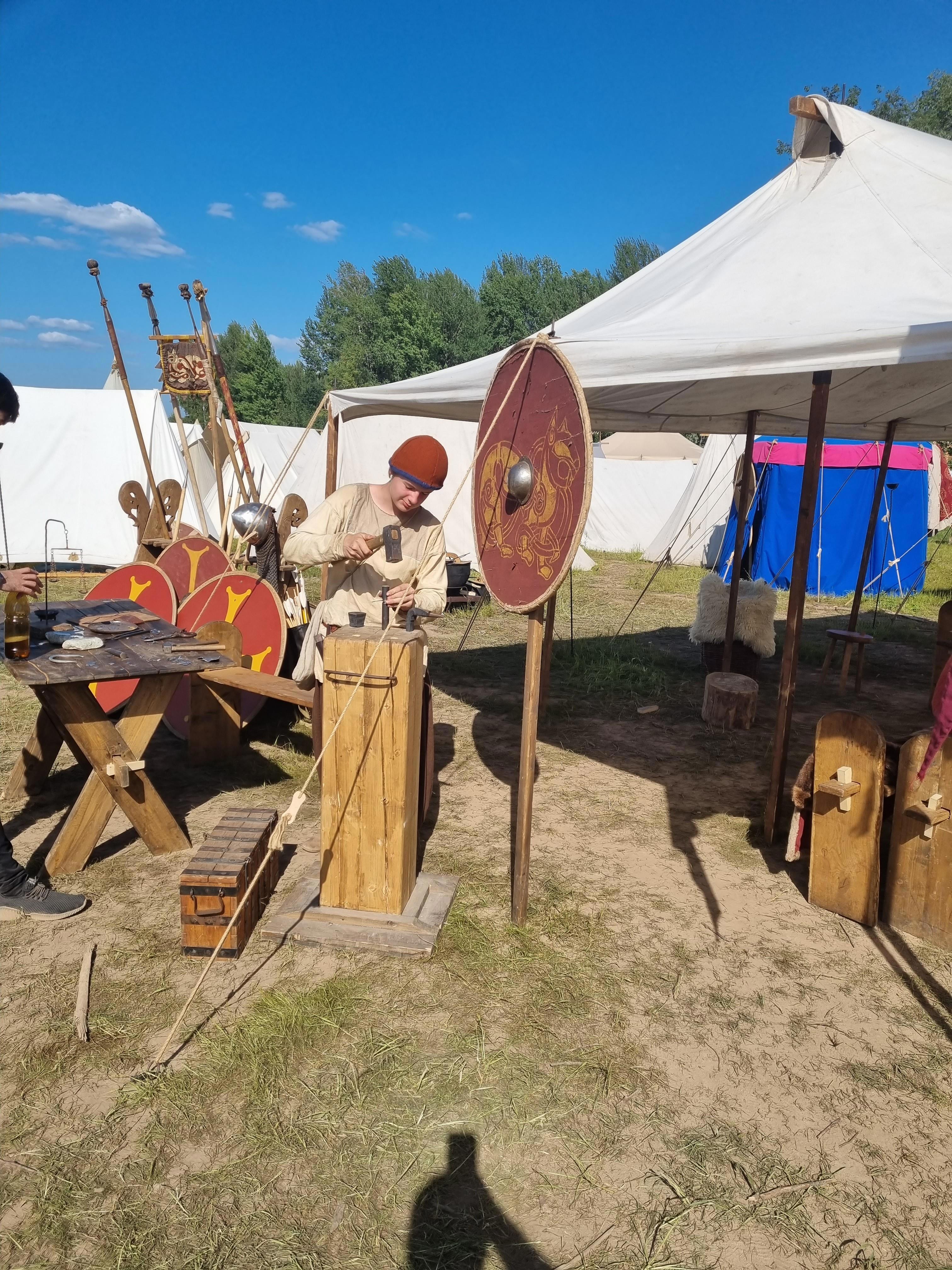 Сердцем Бладгёльда конечно же был палаточный лагерь реконструкторов-участников, в котором они жили, отдыхали, готовили, мастерили и общались с публикой, охотно делясь своими знаниями и позитивным настроем. Везде образовывались стихийные классы, где кучки зевак обступив оратора внимали каждому слову, жадно глазея на артефакты ушедшей эпохи. Нам рассказали про ценность синего цвета в одежде, про важность пояса и ножа на нём, про то, что кошелёк всем должен быть виден и какая удобная обувь из кожи, но только для грунтовых дорог! Детей приглашали на спарринг против умелого воина на мечах, взрослых учили толкаться щитами и фехтовать копьями. Всем желающим давали облачиться в доспехи и примерить шлем, кругом торговали всем на свете - от шкур животных до боевых топоров, а в одной палатке демонстрировали огромного чёрного ворона, свысока поглядывающего на юных по его меркам зевак. Конечно же весь день играла музыка стараниями могучих музыкантов извлекаемая нонстоп из экзотических инструментов. Играли хорошо и задорно как фольклорные мелодии, так и известные всем современные мотивы. По запруде туристов катала ладейка, днём ранее замеченная в самом Великом Новгороде у пляжа под стенами Кремля.