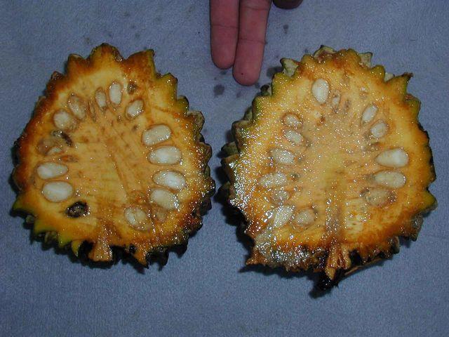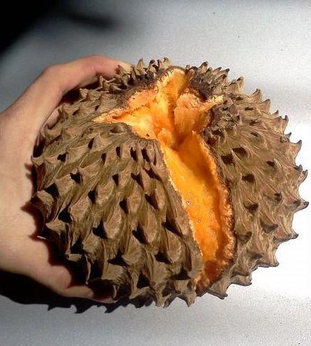 Плод, диаметром до 20 см, покрыт множеством жёстких шипов.