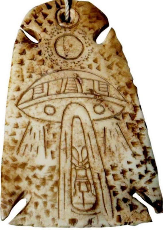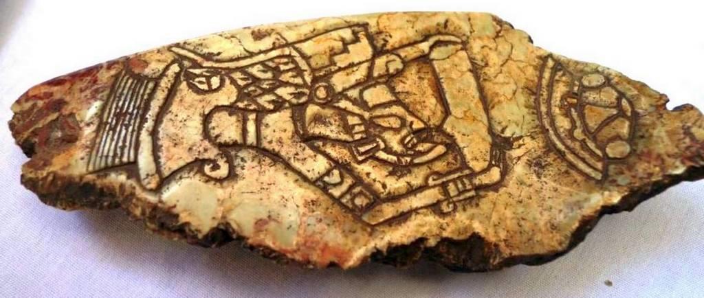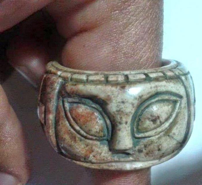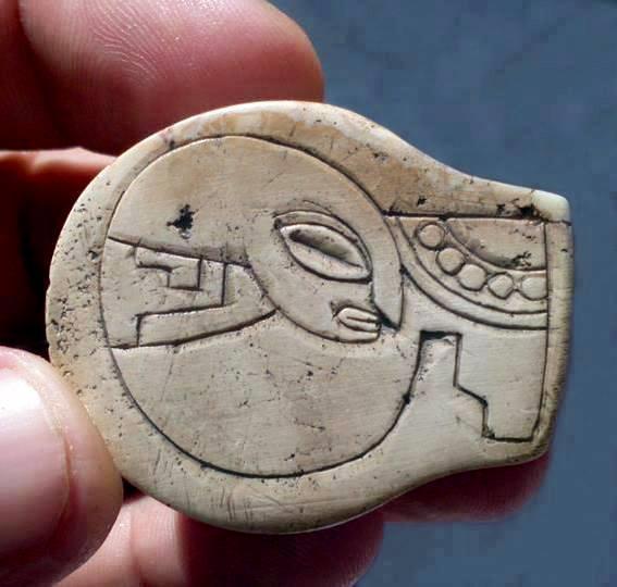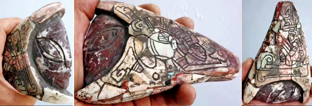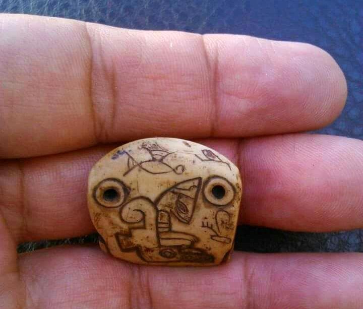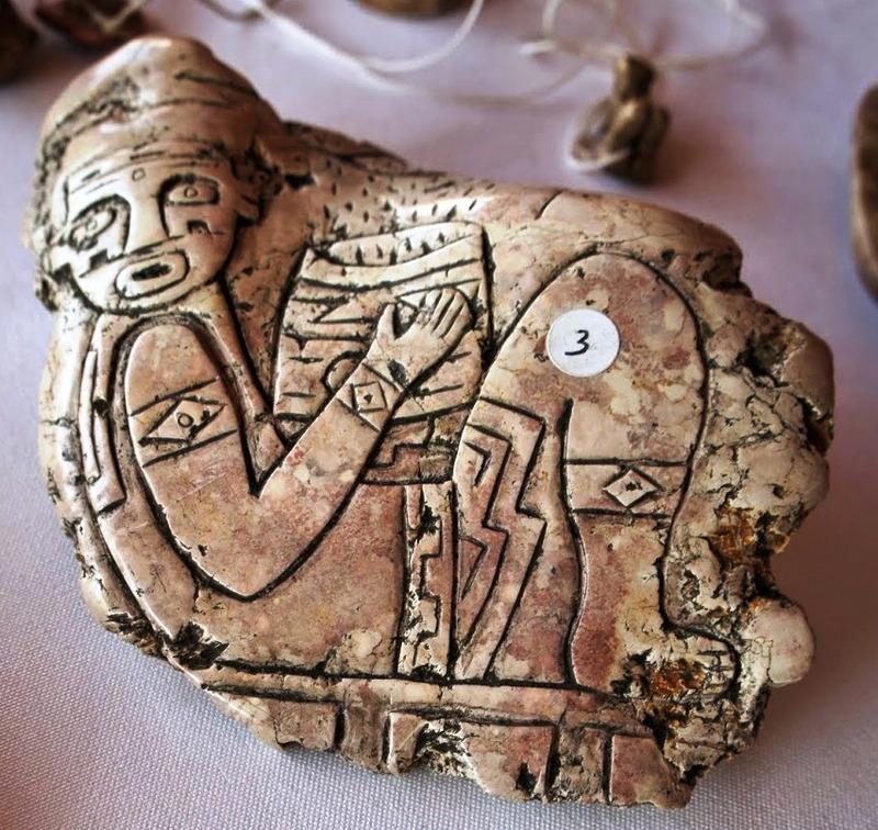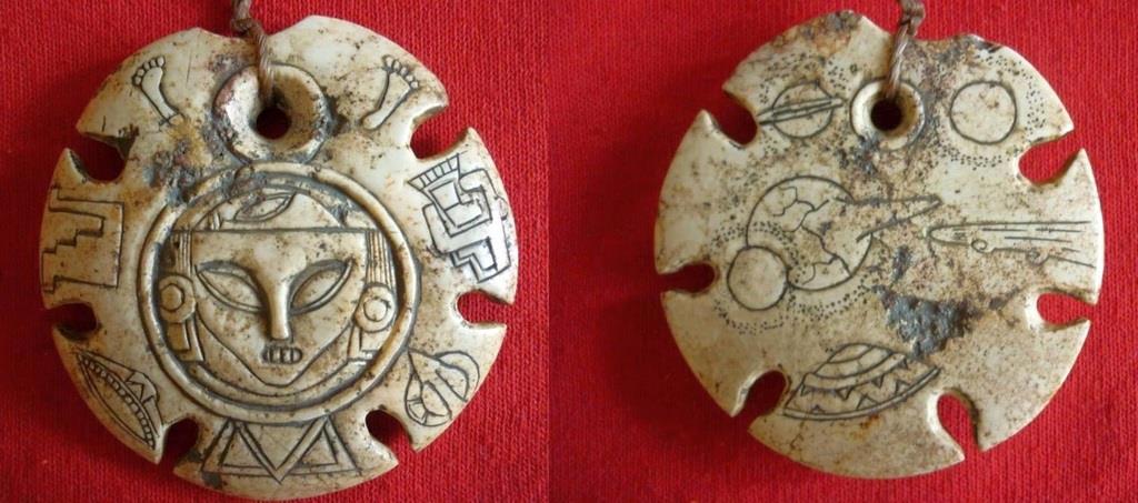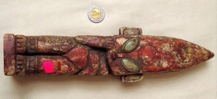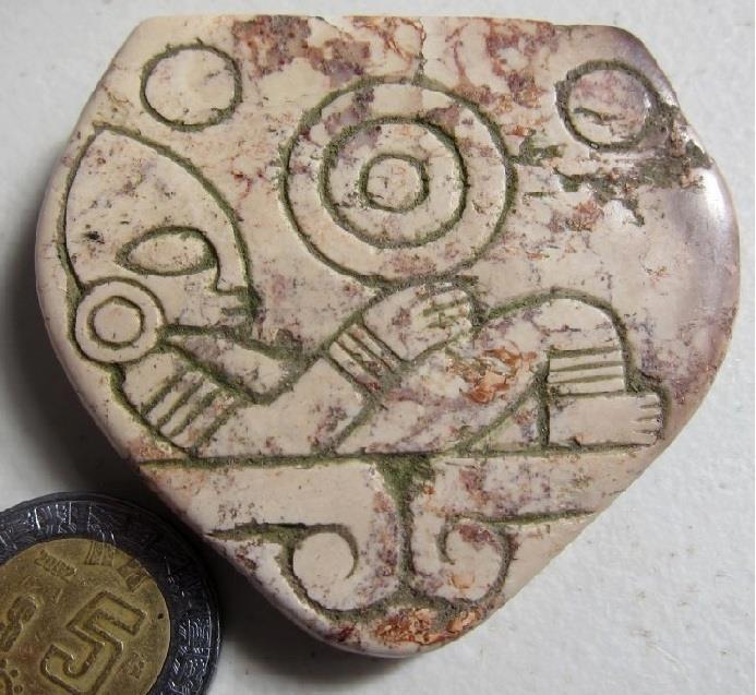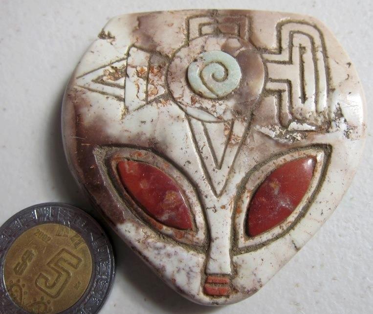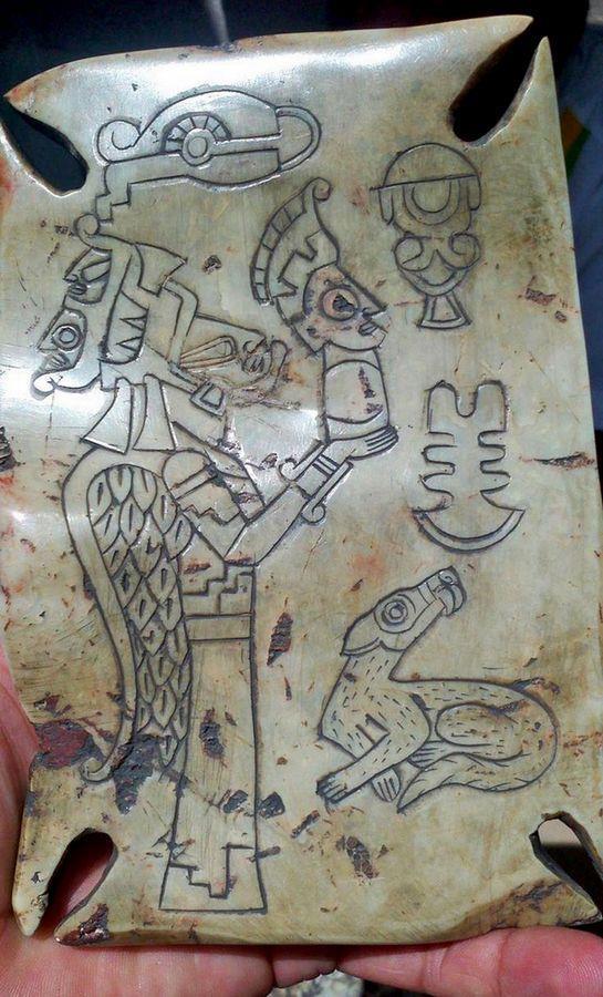 Она выполнена на довольно редком белом нефрите, считающемся, между прочим, священным камнем у индейцев. То есть штучка не дешёвенькая и совсем не простая. Есть керамика и более сложные изделия, чем керамика, просто изображения на камнях или из камней. Вот такое странное «пасхальное яичко» с надписью (жаль, не знаю,что написано...), например, демонстрируется в фильме, который можно увидеть на Ютубе: