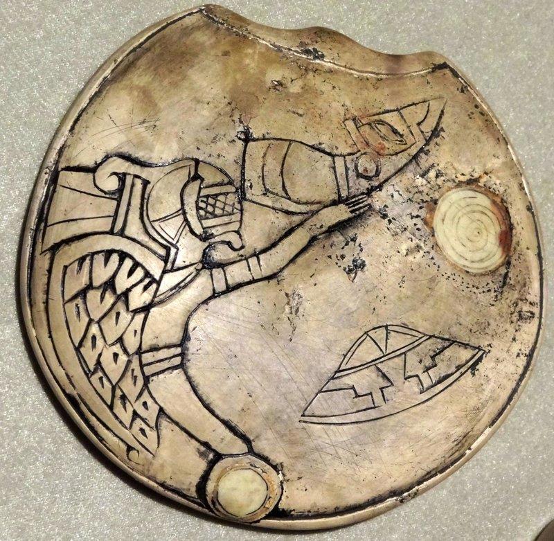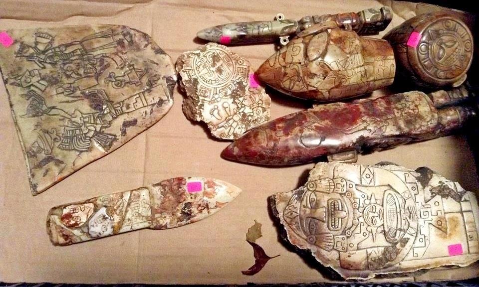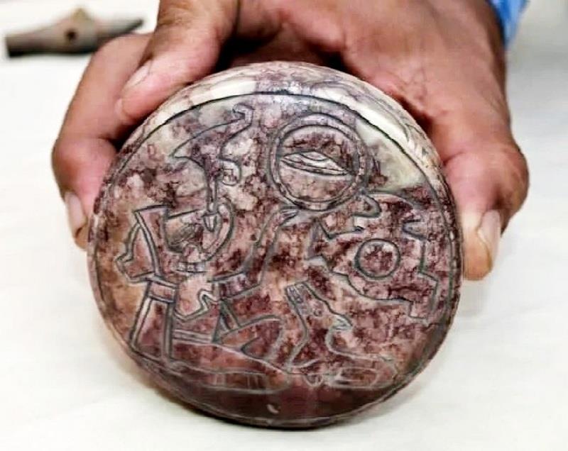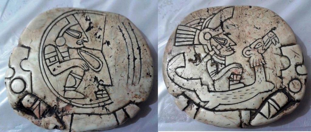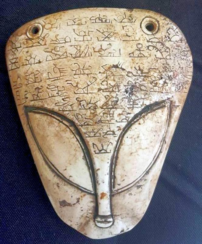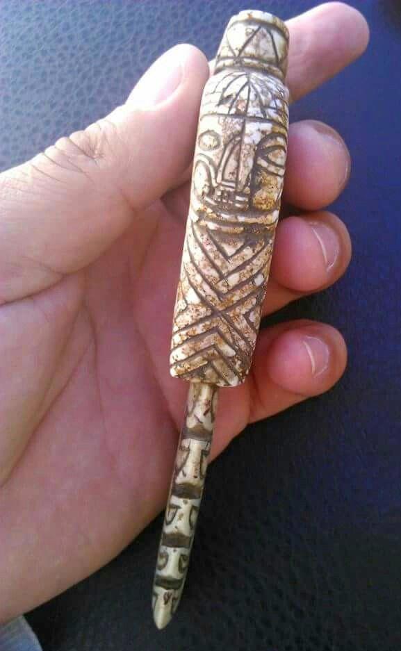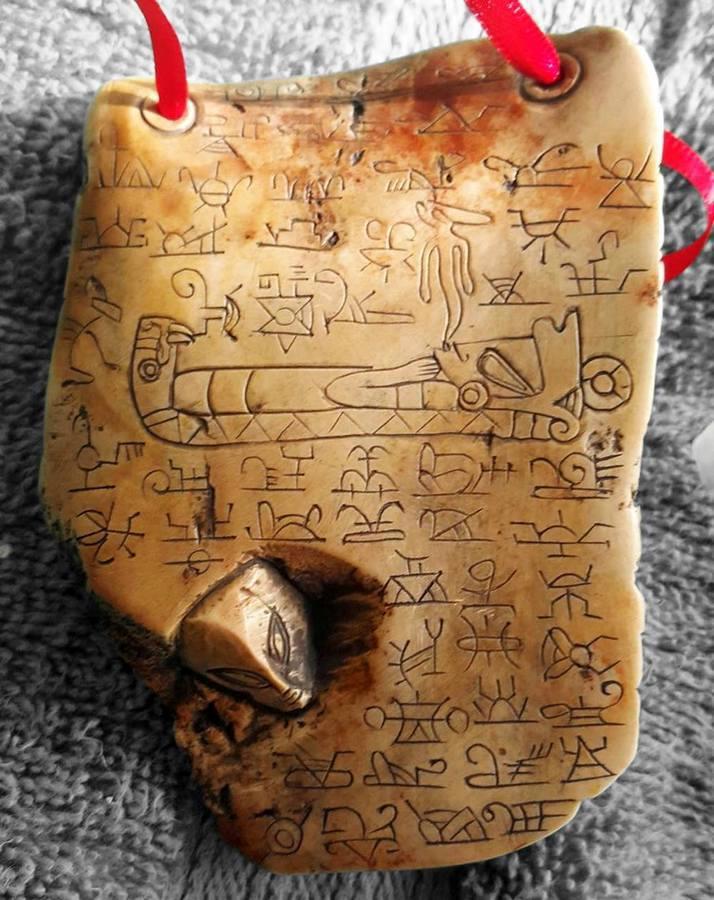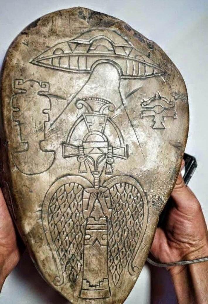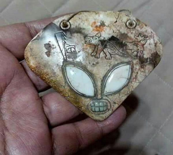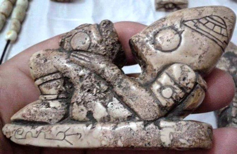 Она выполнена на довольно редком белом нефрите, считающемся, между прочим, священным камнем у индейцев. То есть штучка не дешёвенькая и совсем не простая. Есть керамика и более сложные изделия, чем керамика, просто изображения на камнях или из камней. Вот такое странное «пасхальное яичко» с надписью (жаль, не знаю,что написано...), например, демонстрируется в фильме, который можно увидеть на Ютубе: