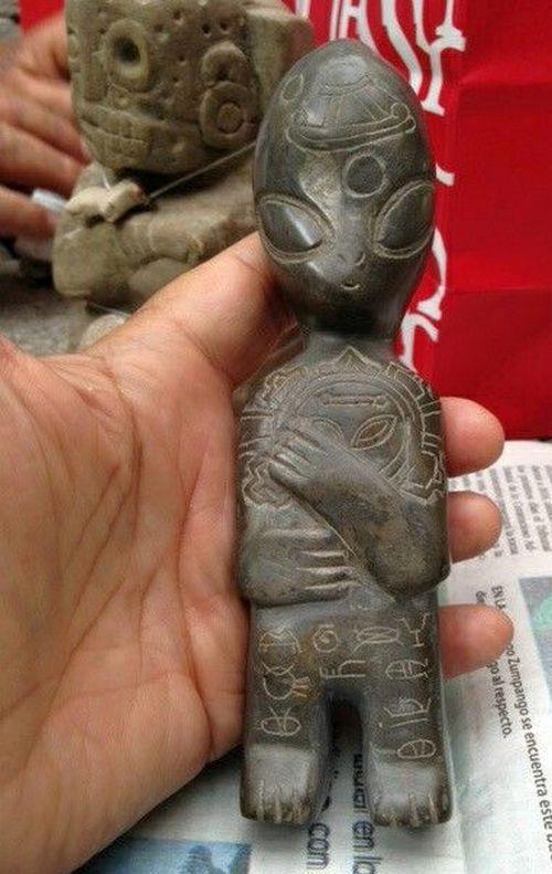 Кстати, Гарсия Санчес щи лаптем не хлебает и поставил всё дело на вполне даже системную основу, для чего в городе Охуэлос организовал общественную организацию из активистов и местных под названием Оллин МНИАИ (как переводится – не знаю). Члены организации собрали такую коллекцию странных штук, что сами уже теряются в цифрах. Одни говорят, что их больше, чем 350, а другие говорят, что их чуть меньше, чем 400! В общем, если кто-то поедет туда и ему там кто-то втихаря продаст, несомненно подлинный артефакт из-под полы, то не сомневайтесь – это никакая не подделка. Всё по-настоящему. Он ничем не хуже тех, что находятся в коллекции. А ещё они создали постоянную телепрограмму под названием «Потерянный рай Ацтлана» (Aztlan El Parasio Perdido) на местном канале. Для тех, кто подзабыл подробности, напоминаю, что Ацтлан (Aztlan) – это легендарная прародина легендарных ацтеков. Между тем энергичному «вождю краснокожих» всего этого показалось мало, и он привлёк для изучения находок Мексиканский Научный Институт Антропологии и Истории (МNAH). Историки сверили представленные артефакты со своими каталогами и сделали возмущённое заключение, что они с ихними каталогами не имеют ничего общего, а потому являются грубыми подделками. Вообще у историков получилось смешно, потому что они ссылаются на искусство майя и говорят, что изображения им не соответствуют. А причём здесь именно майя, не говорят. Ну, и насчёт «грубых» я бы тоже поспорил, между прочим. Хоть и странноватые по содержанию, но вполне даже симпатичные сувенирчики: