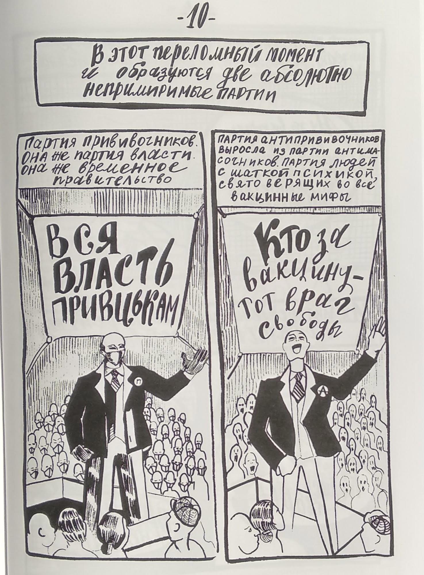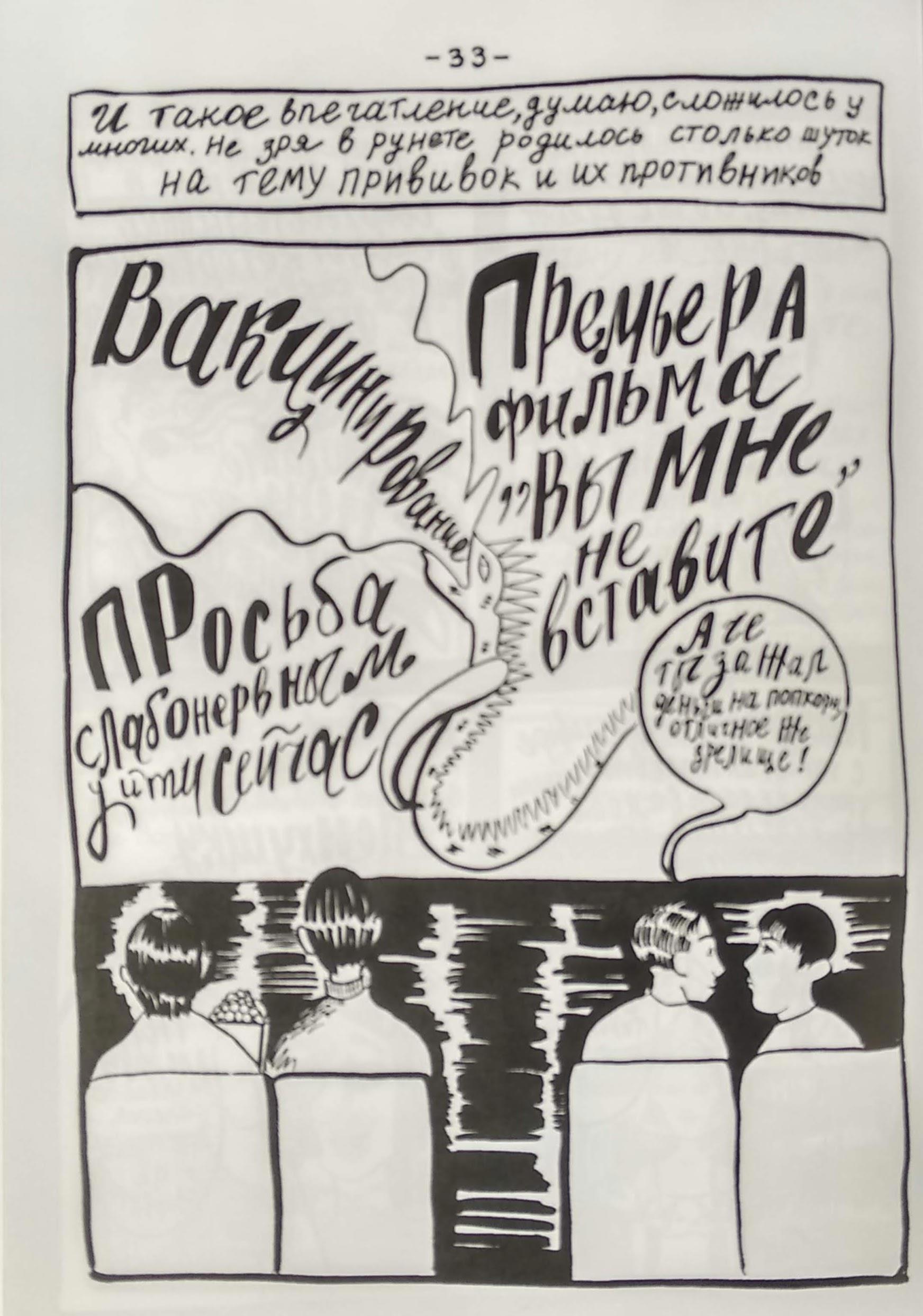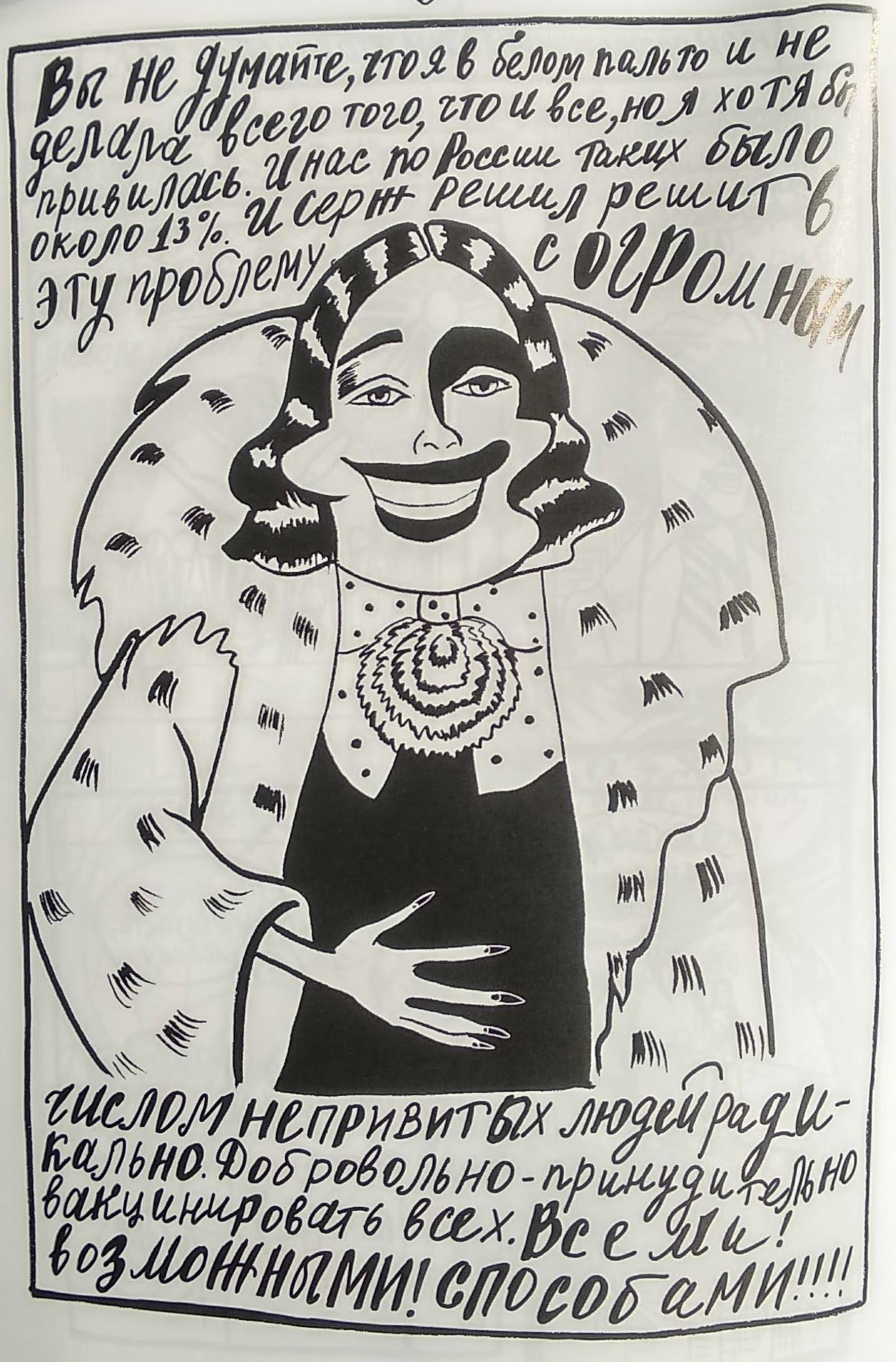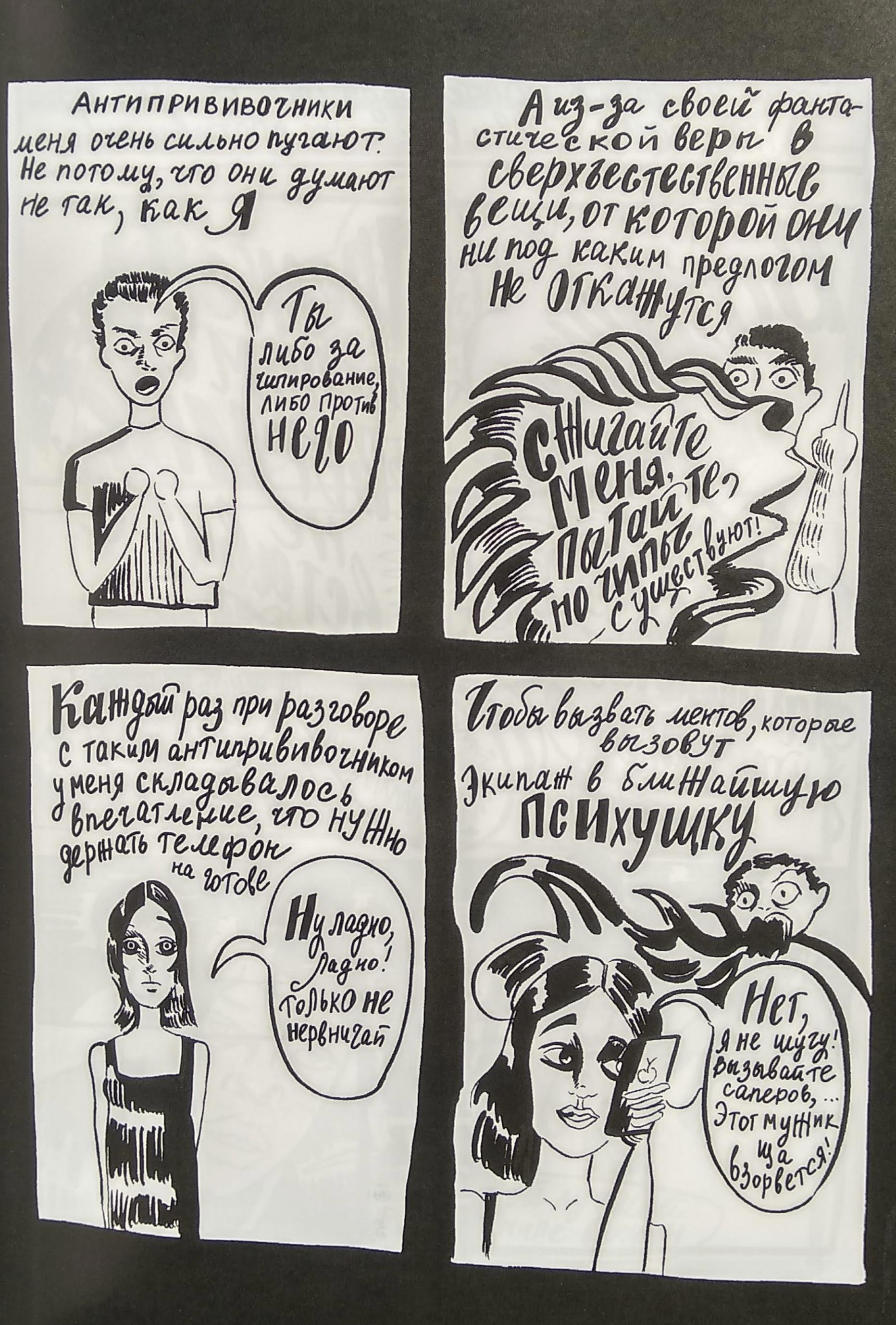На первый взгляд, кажется, что это комикс - агитка делать прививки, но когда начинаешь внимательно его читать, выясняется, что это социальная сатира, в которой Илона смеется абсолютно над всеми, в том числе и над собой.