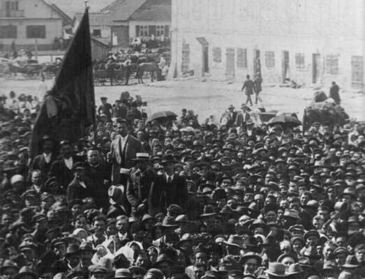 После распада Австро-Венгерской империи возвращается на малую родину и вот там то, на многотысячном митинге в городе Тарнобжеге, вернувшийся фронтовик Домбаль и опальный ксендз Оконь объявляют о создании Тарнобжегской советской республики. Вот фото этого митинга. Пишут, что выступает ксендз Эугениуш Оконь, но я сомневаюсь. Он, по моему, ниже оратора стоит.
