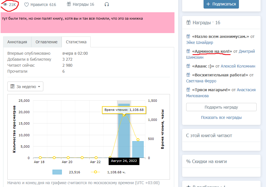 Банальная математика, друзья. Исходные данные: 3 главы общей суммой в 1,5 алки, 21 тысяча просмотров на книге (напоминаю, свежий акк, без подписчиков), 1100 часов чтения в первый день, 3200 библиотек. На полторы алки текста.