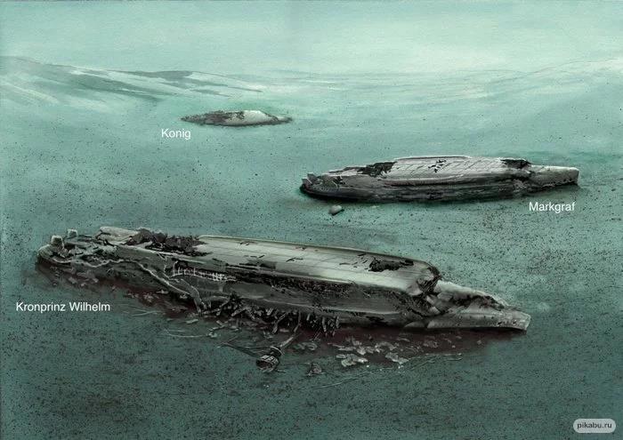 Как я уже сказал, в 10.30 утра 21 июня 1919 года контр-адмирал Людвиг фон Ройтер отдал приказ экипажам затопить корабли. Со своими боевыми товарищами - другими кораблями Кайзерлихмарине, в этот же день ушёл на дно и линкор «Кронпринц Вильгельм».