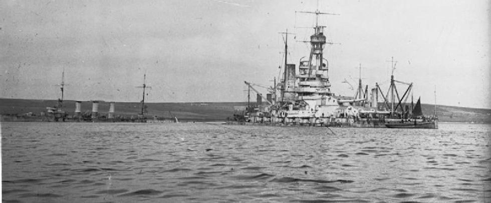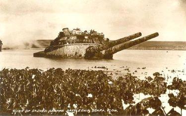 (Надстройки германского линейного крейсера «Гинденбург», оставшиеся над водой после самозатопления Флота открытого моря в Скапа-Флоу, во время отлива. «Гинденбург» стал последним крупным боевым кораблём германского императорского флота, введённым в строй в мае 1917 года. 21 июня 1919 года при затоплении он не перевернулся, а лёг на дно на ровный киль. В июле 1930 года линейный корабль был поднят со дна, после чего разделан на металл.)