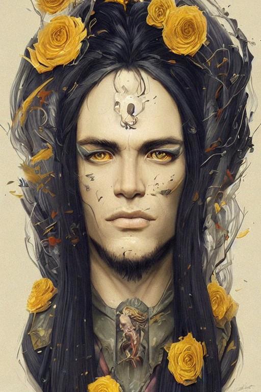 Например: красивый мужчина, с длинными волосами, с жёлтыми глазами, портрет, детальное изображение, обои