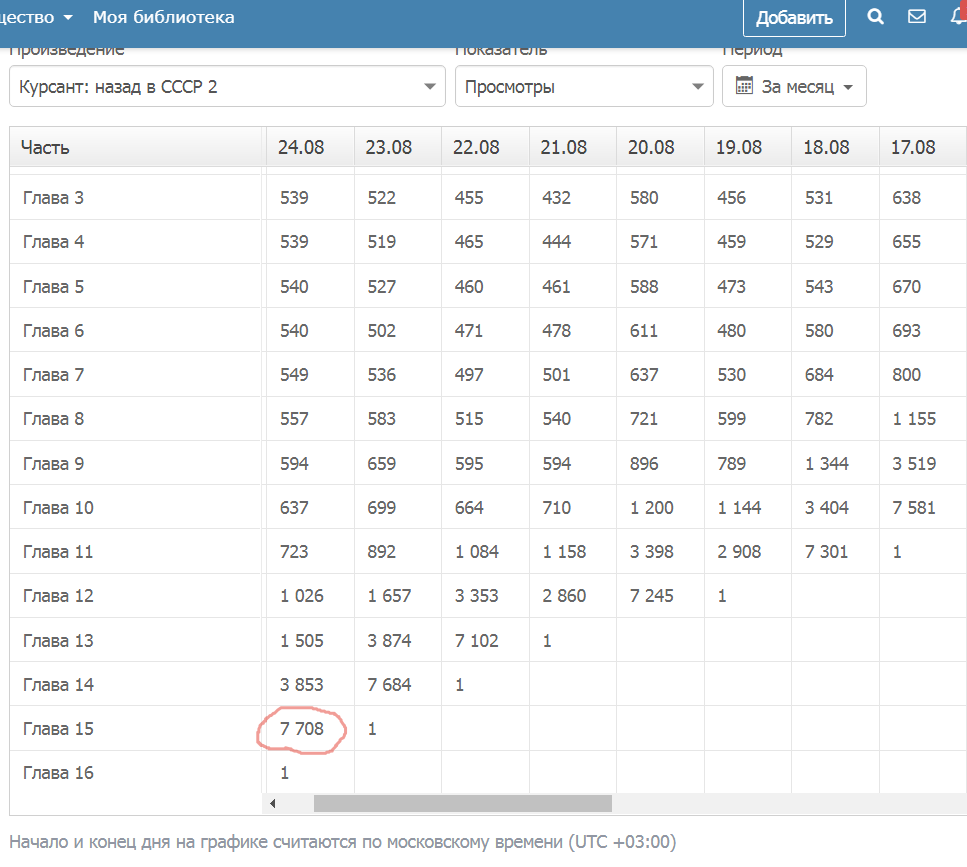 князь тишины. На 23 августа статистика закрылась с 19 тысячами просмотров и 1.5 к часов. При этом объём текста на 23 августа это 10 глав и порядка 180 тысяч знаков.