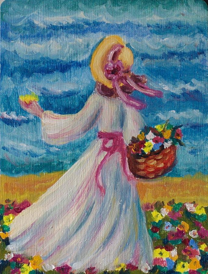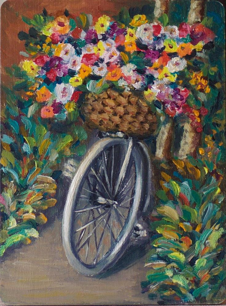 Автор: Ольга ЛевоновичНаписала парочку миниатюр маслом на дощечках, 10х15. Велосипедик на заказ, девушку просто так.