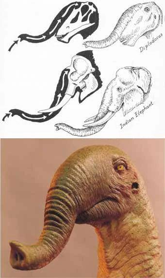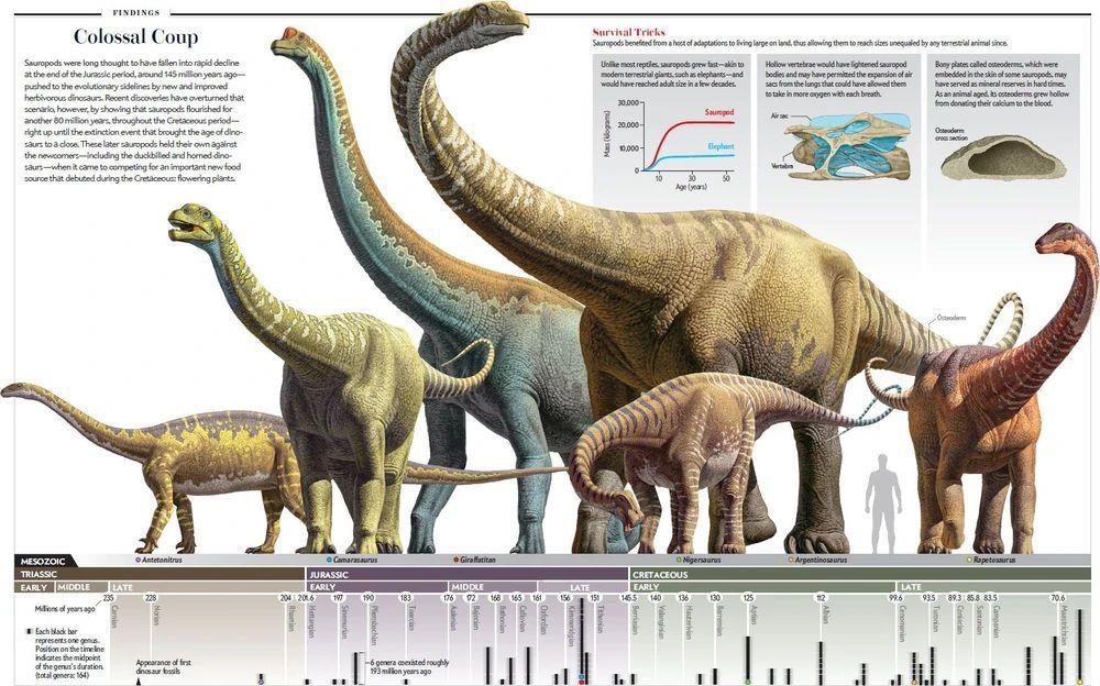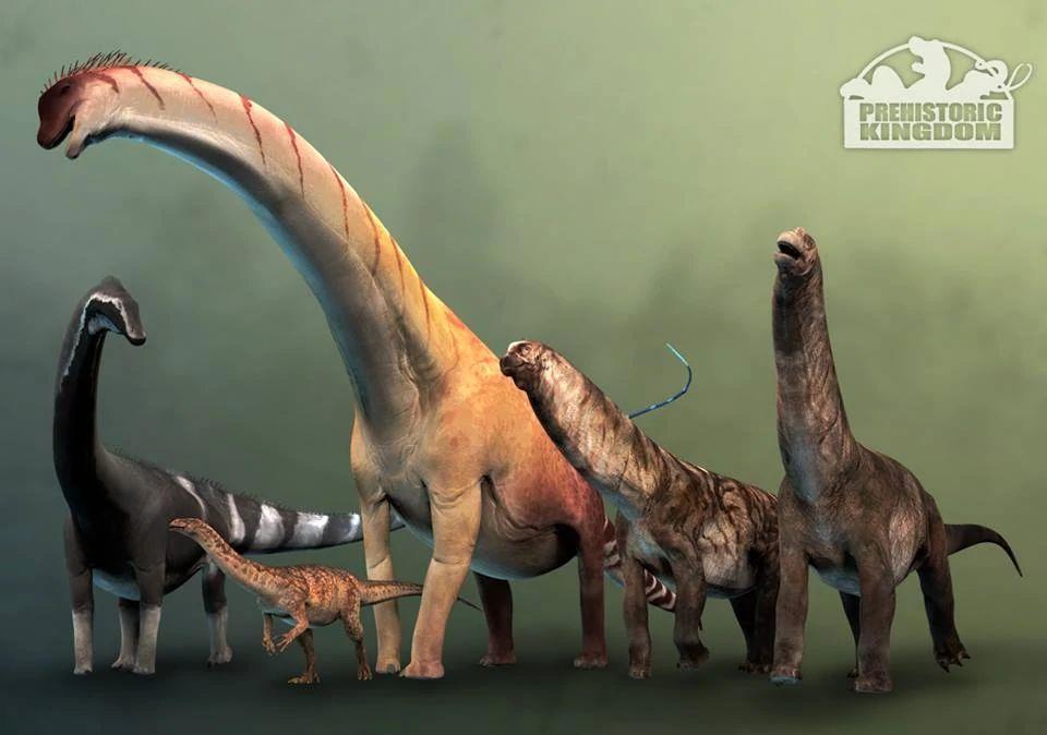 Родственники карнозавров - зауроподы, быстро перешедшие на растительную пищу, вернулись вновь к четвероногому передвижению и поселились у берегов водоемов. В юрском периоде они достигли невероятных размеров: длиной до 30 м, массой до 50 тонн! Медлительные на суше и хорошие пловцы; их длинные шеи помогали доставать корм с большой глубины. Немногие пережили середину мела - их остатки немногочисленны.