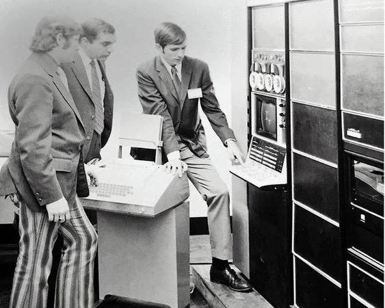 Детали на этой картинке показывают, как далеко мы продвинулись в развитии технологий. Огромный PDP (программируемый процессор обработки данных) возвышается над тремя инженерами на этом снимке. Эти полосатые брюки - явный признак того, что этот образ относится к 1970-м годам.