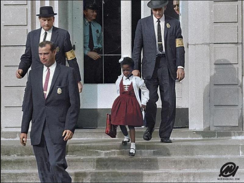 Эта фотография знаменует собой начало конца сегрегации в государственных школах в США. На ней изображена юная Руби Бриджес, охраняемая федеральными маршалами возле начальной школы Уильяма Франца. Для нее не имело никакого смысла поступать в другие школы, потому что Уильям Франц находился всего в нескольких кварталах от того места, где она жила в Новом Орлеане.