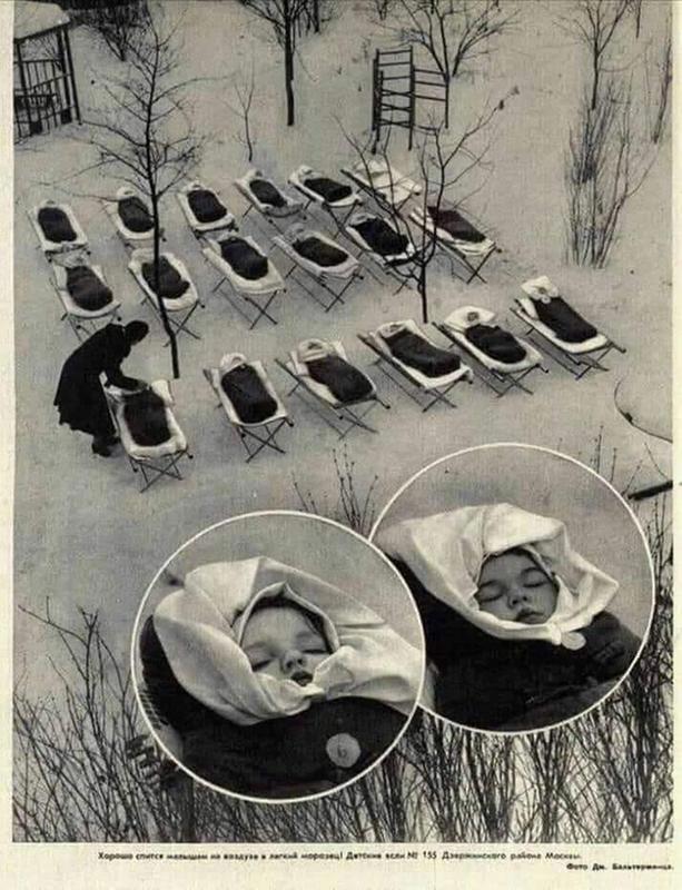 С этими младенцами в Москве с самого начала обращались так, как будто их готовили для КГБ. На этом снимке изображена больница в России, в которую помещают младенцев в холодную погоду. Это традиция, которую, по-видимому, до сих пор практикуют некоторые российские матери.