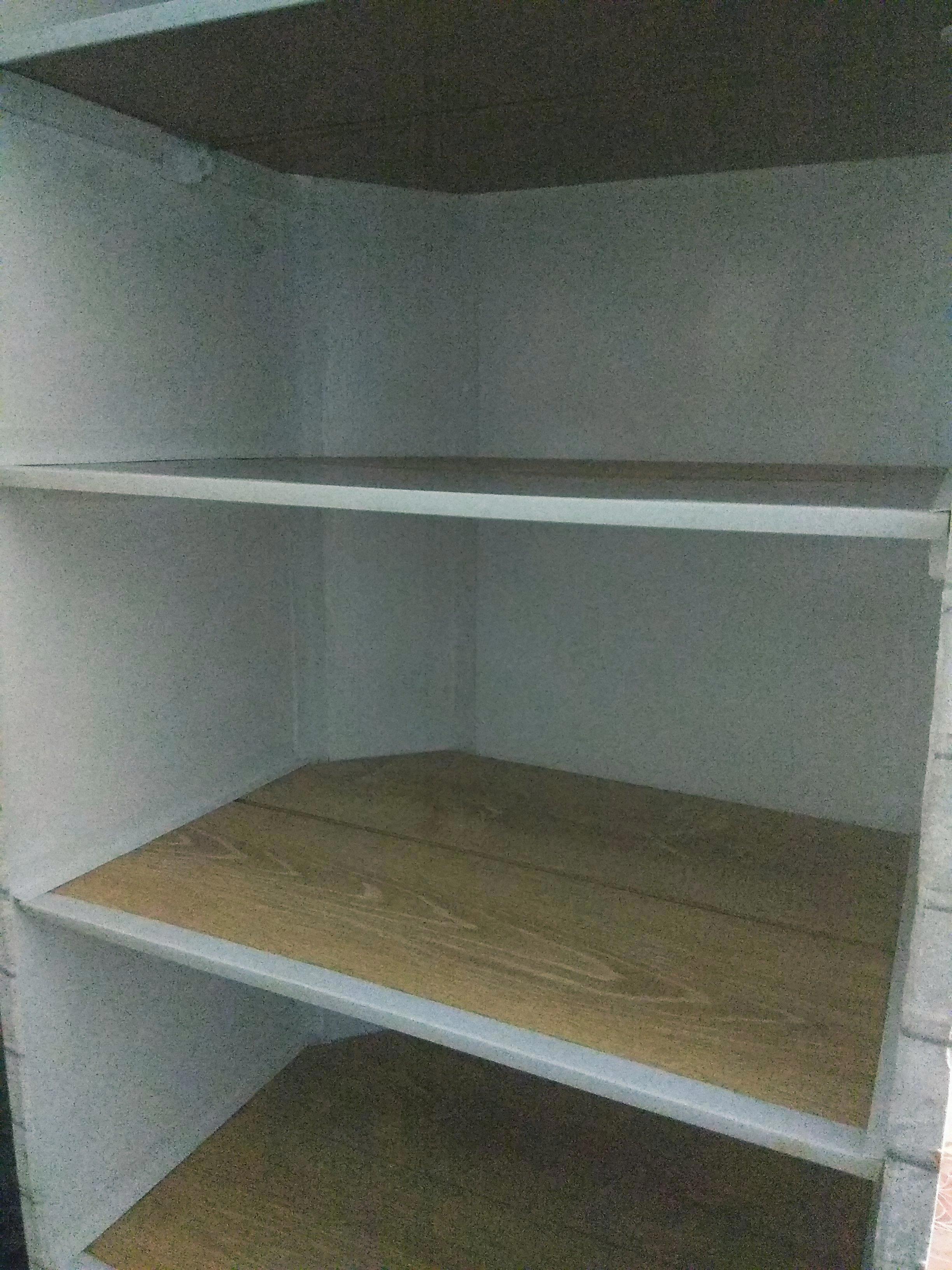 Вот такой вариант меня устроил. Там еще пришлось дорабатывать пластиком стыки. Вниз я планирую всунуть пластиковую этажерку с двумя ящичками для белья. Теперь осталось решить вопрос с дверьми. Хочу заказать решетчатые в Леруа Мерлен. Но какое-то время моему шкафу придется постоять без дверей.