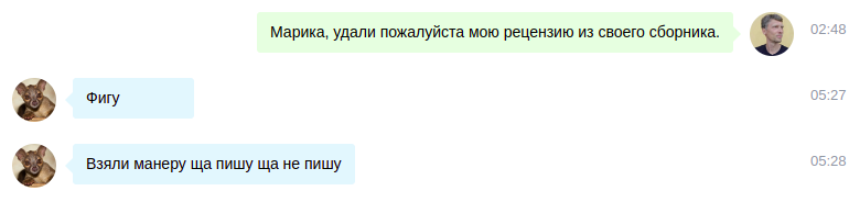 В результате мое понимание книги было неполным и моя рецензия к первой книге — это рецензия человека, который читал книгу по диагонали. Поэтому я удалил эту рецензию. Просил Марику удалить мою рецензию из её сборника, но она отказалась. После жаркого спора с ней, где я утверждал, что ей плевать на качество своего текста, а самое главное - количество рецензий, она ответила, что это не так. Что ей не количество рецензий важно, а чтобы ее книгу понимали. но когда я настойчиво попросил ее удалить мою рецензию из её сборника рецензий, она ответила мне это: