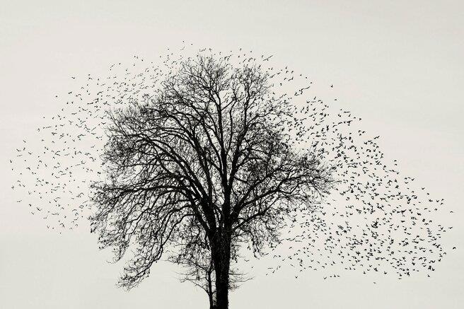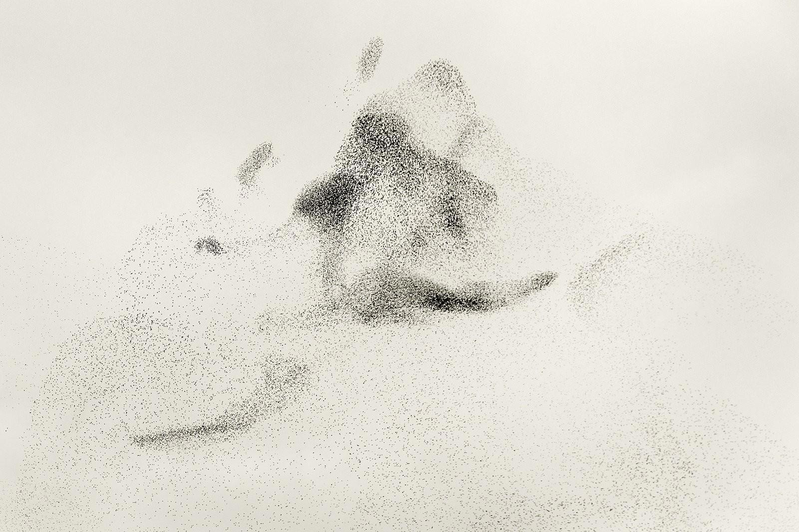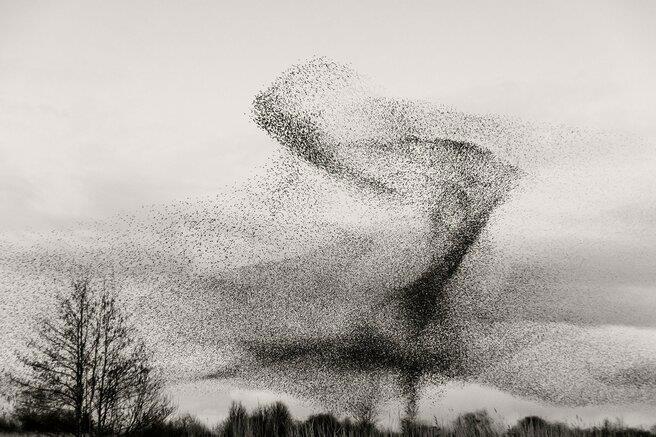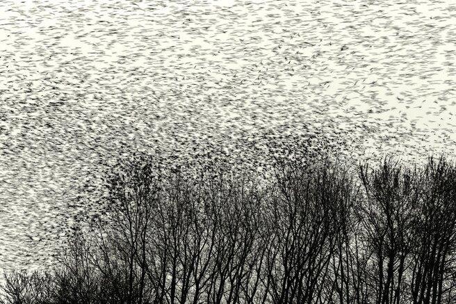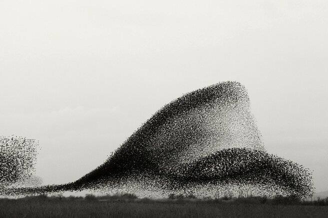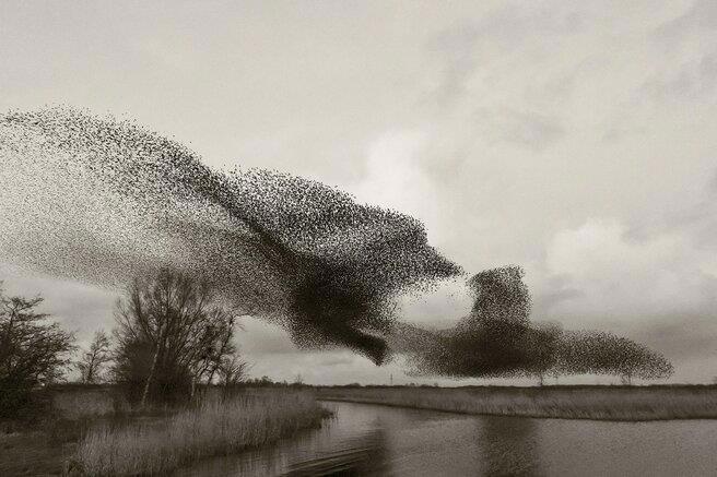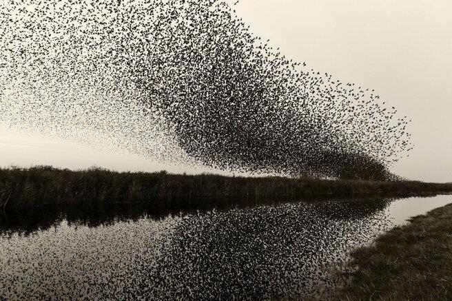 Эти экспериментальные фото впоследствии образуют цикл «Чёрное Солнце».На южных датских болотах собираются миллионы птиц и, прежде чем мигрировать, демонстрируют в воздухе невероятное шоу; огромные стаи действуют как единый организм.