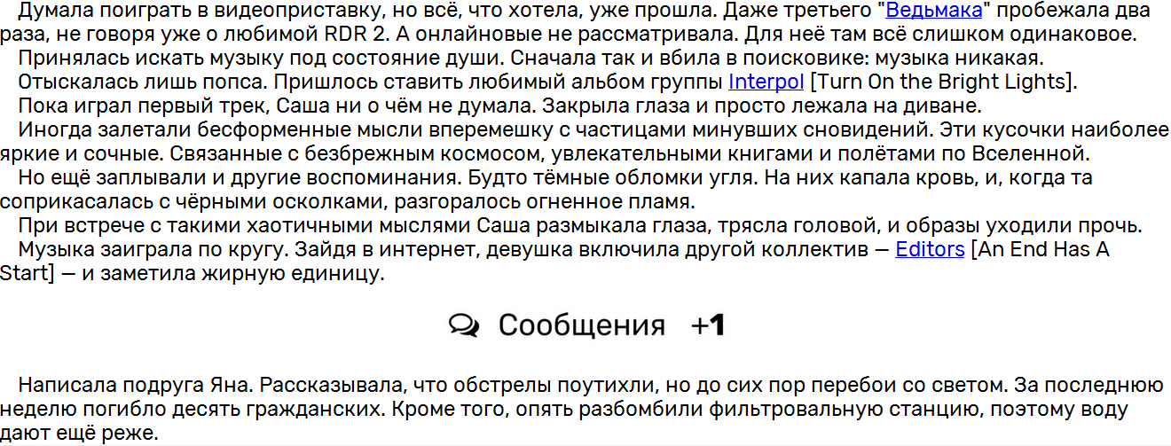 Публикация в электронном виде, даёт нам несравненное преимущество перед бумагой: мы можем оставлять пасхалки с моментальной отсылкой! Например, если герой слушает музыку, читатель нажимает по ссылке и попадает на видео-клип или же сразу на альбом исполнителя.