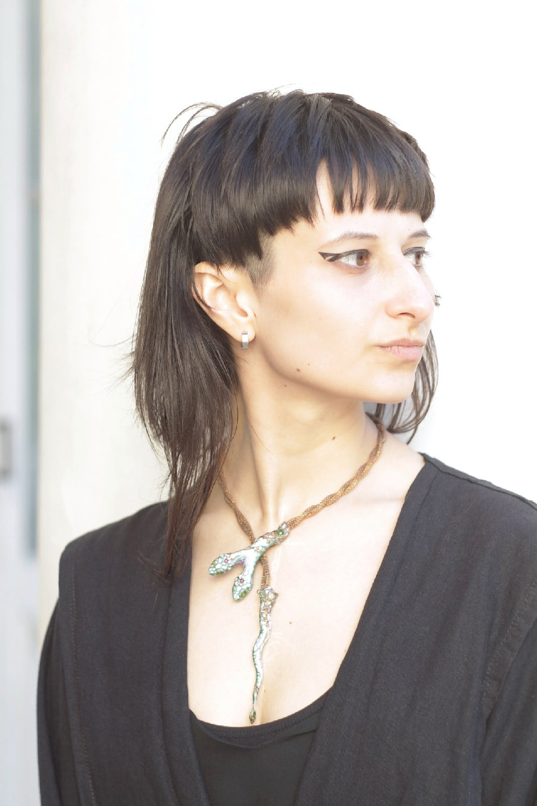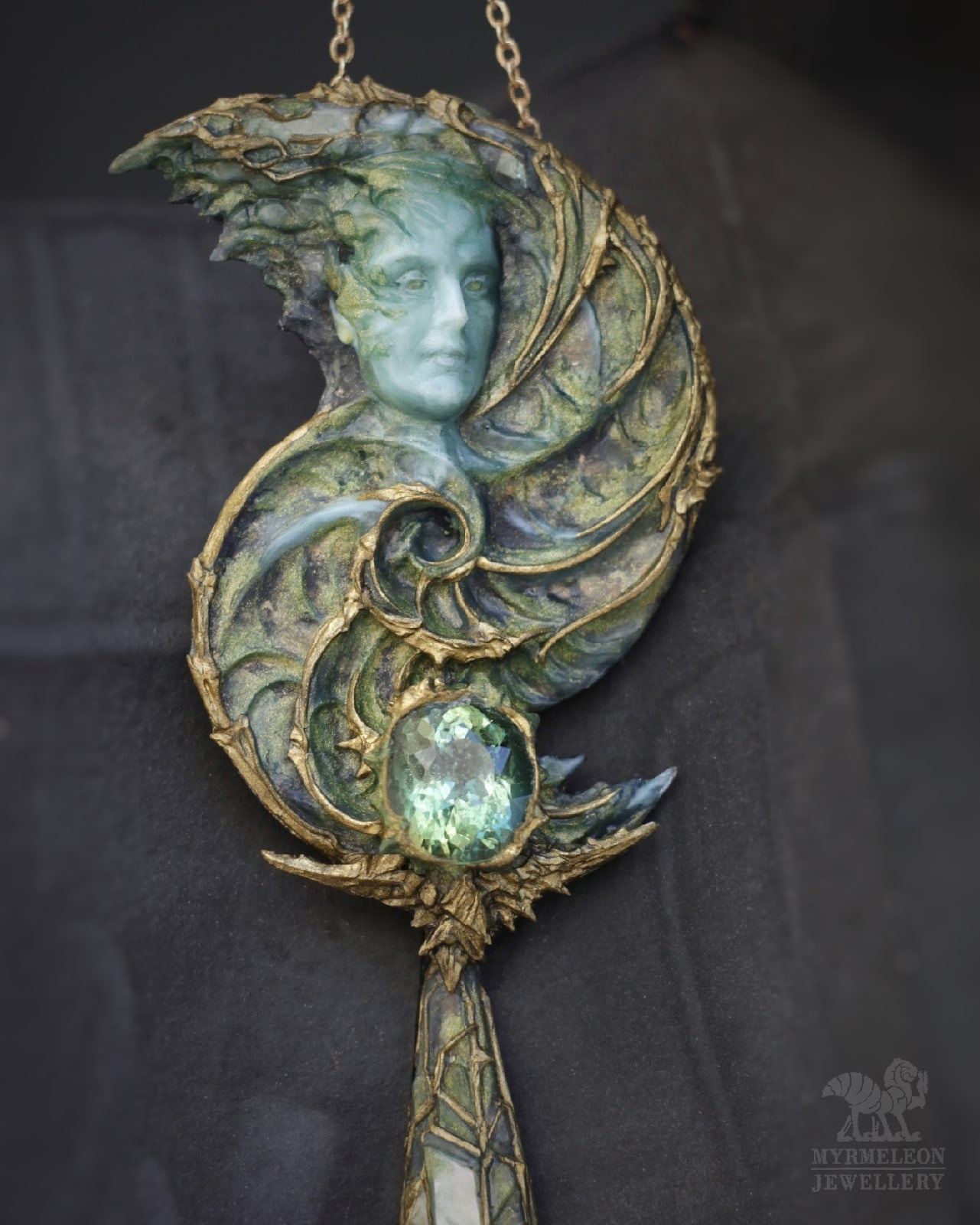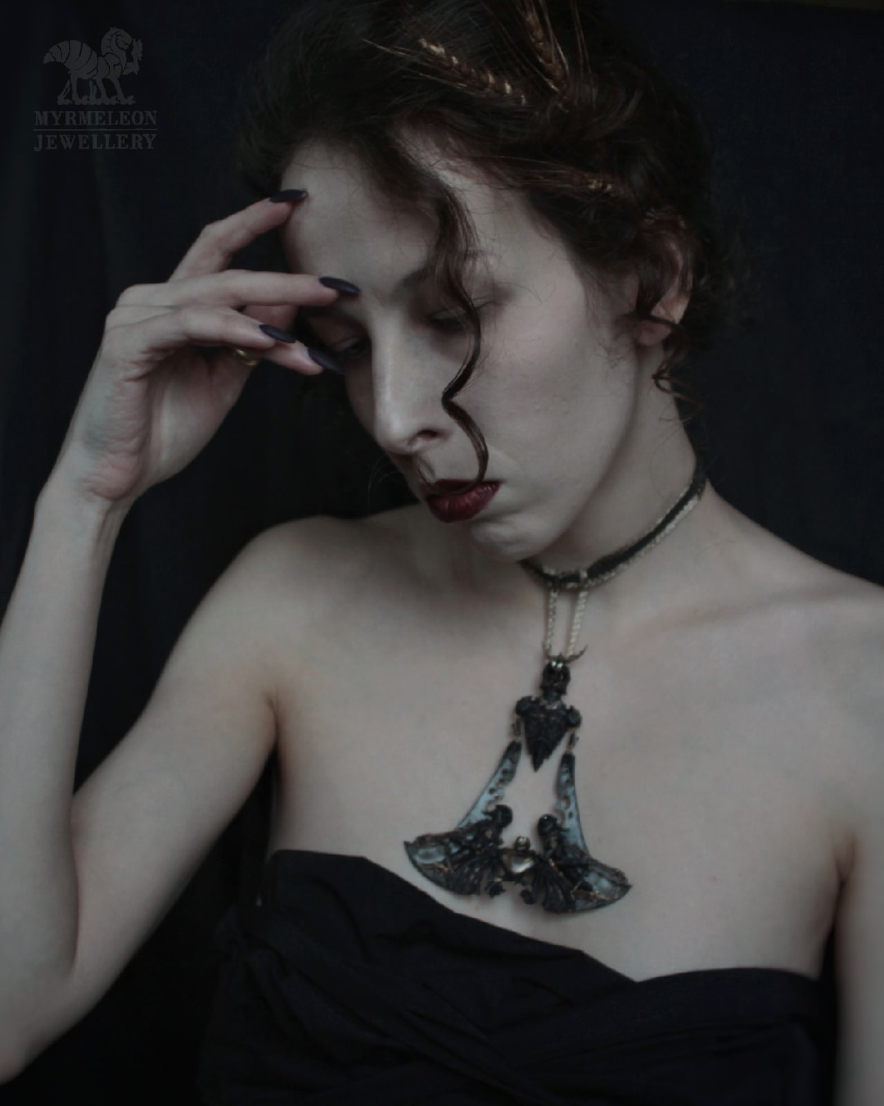 Чаще всего Myrmeleon Jewellery (Дарья Селецкая) делает крупные броши, колье и серьги. Селецкая - мое совсем недавнее открытие. Поэтому вместо своих слов я просто буду ее цитировать.