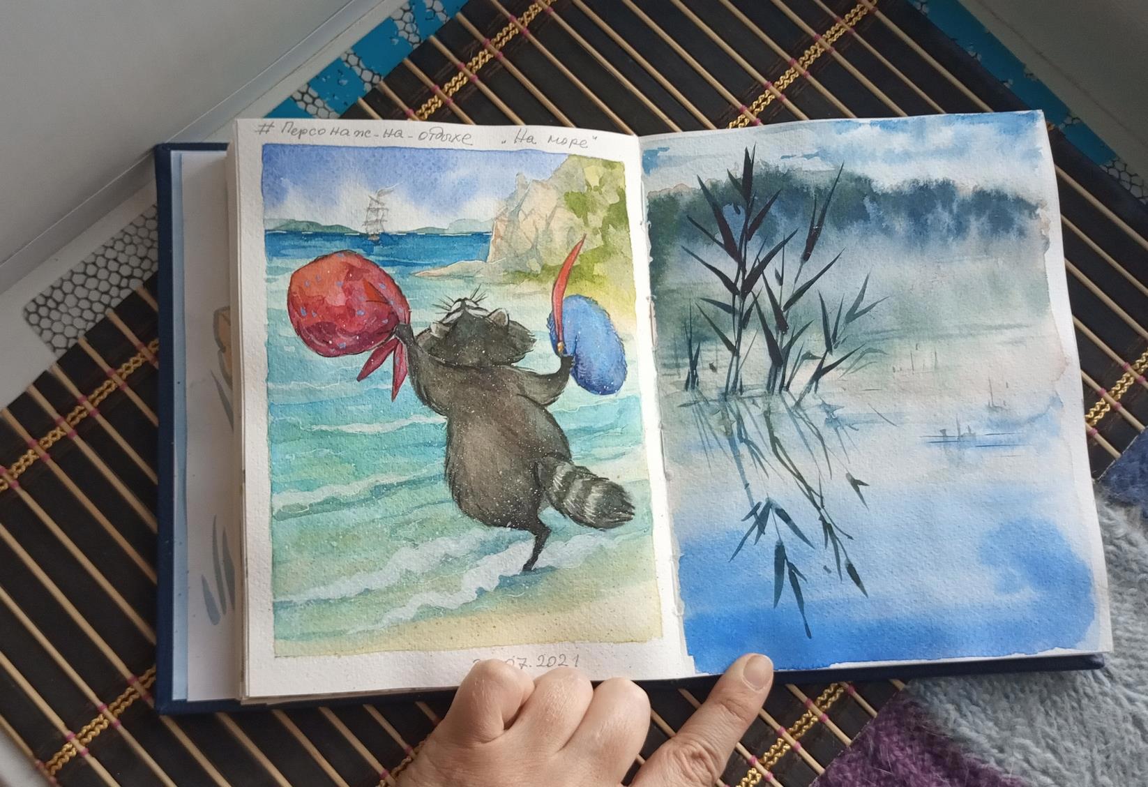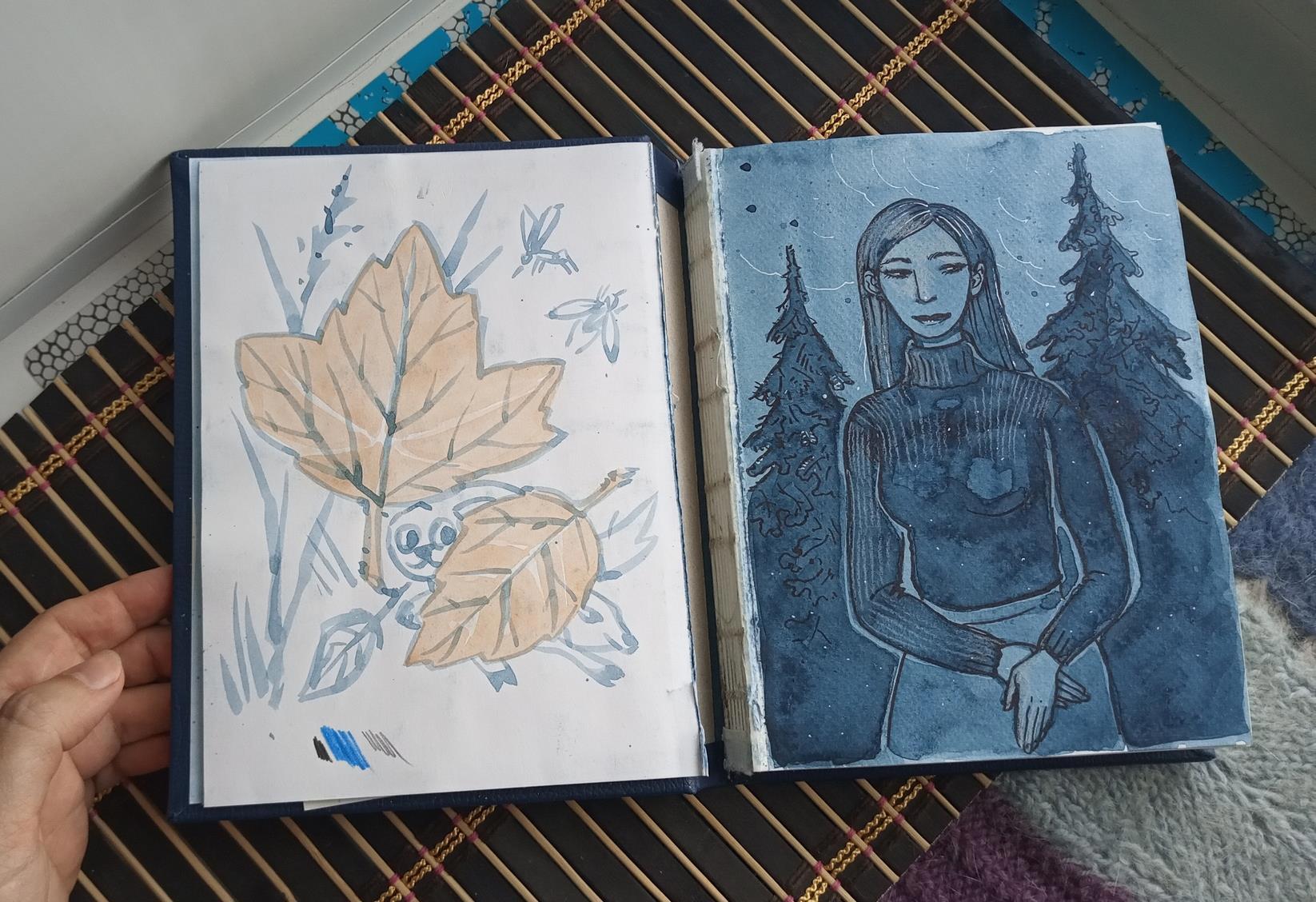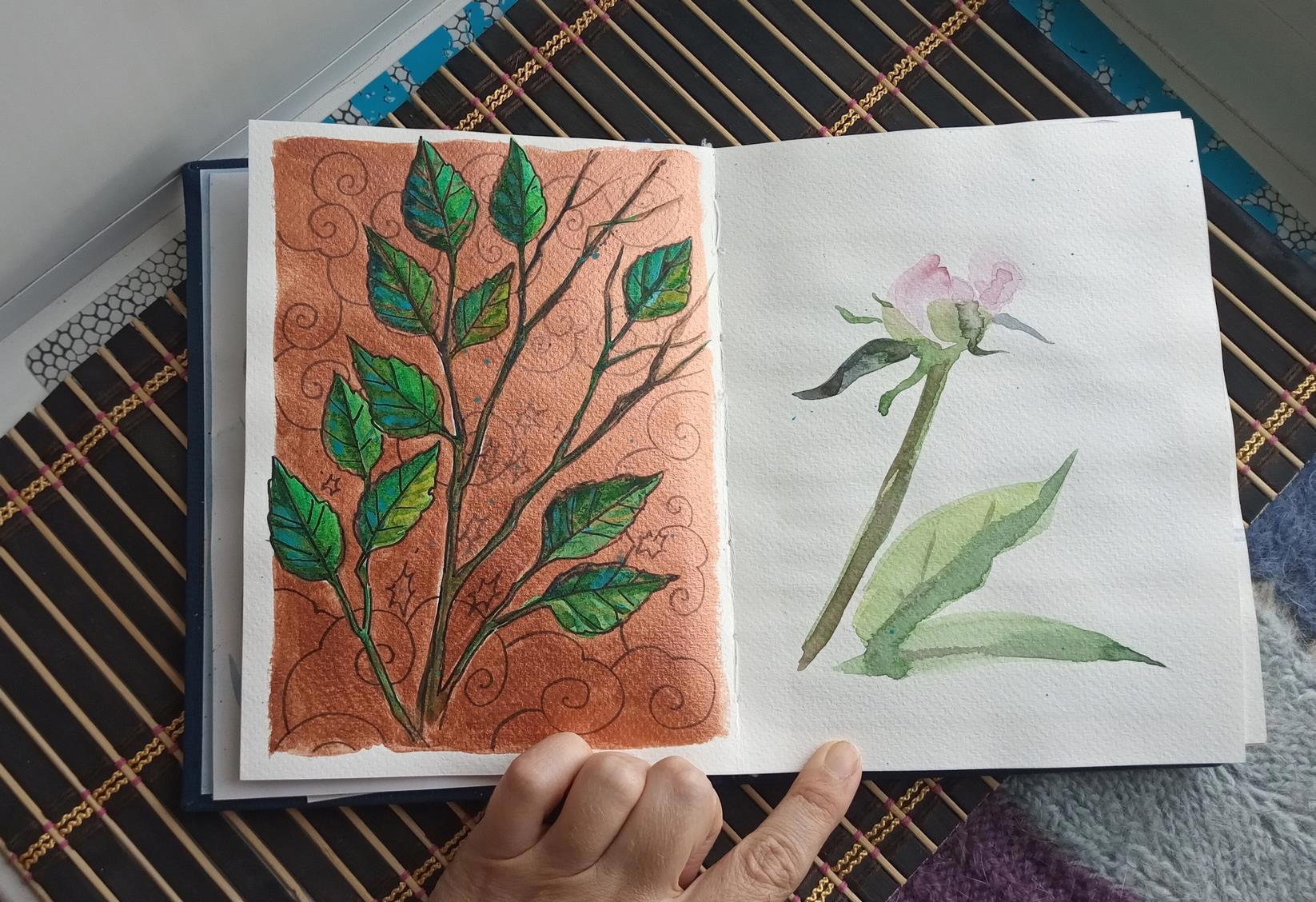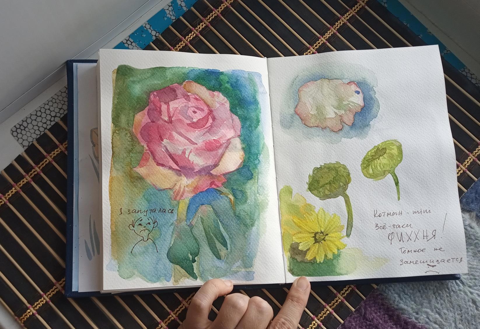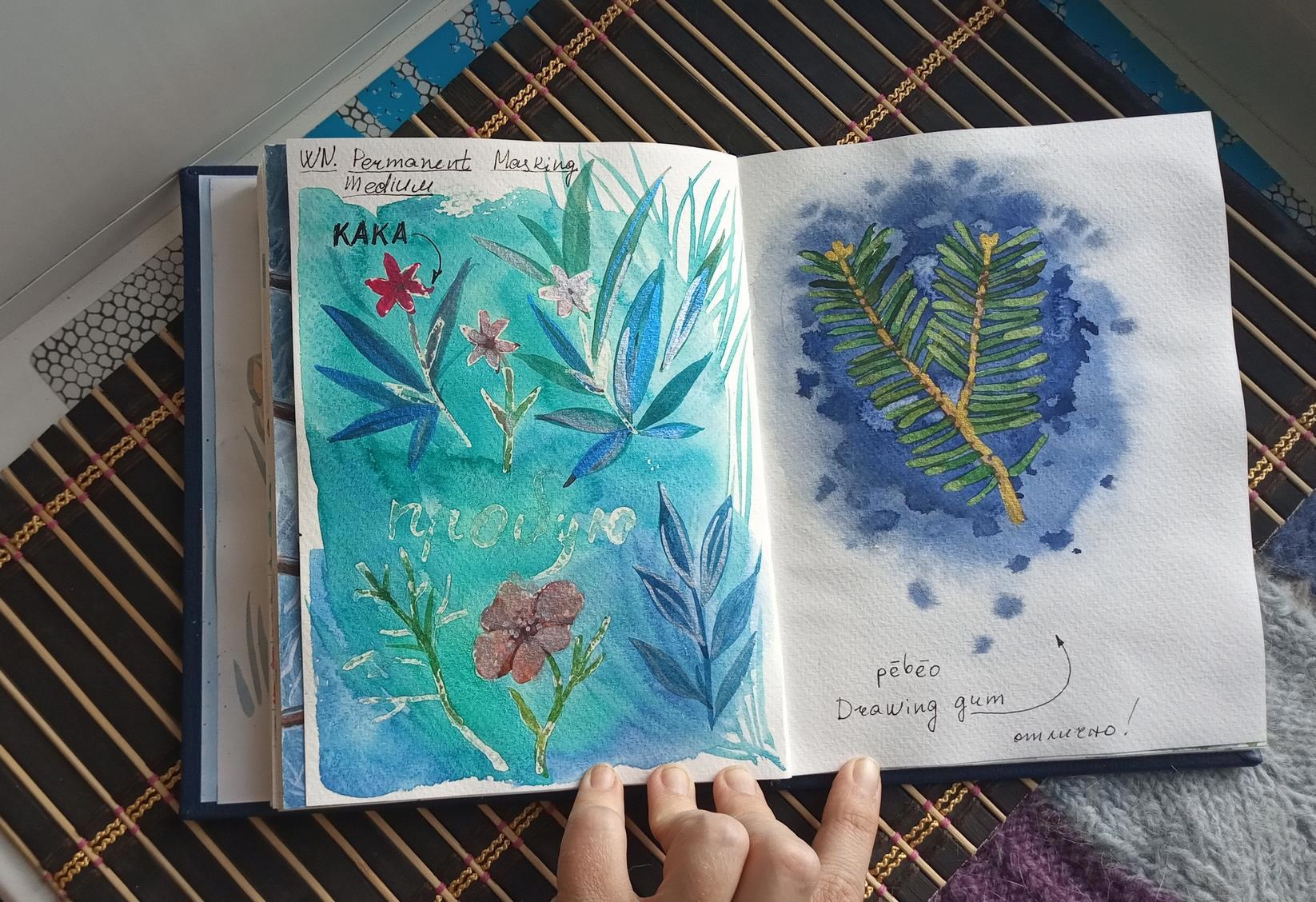 Тут попробовала порисовать на развороте. Не понравилось - сгиб всё портит.